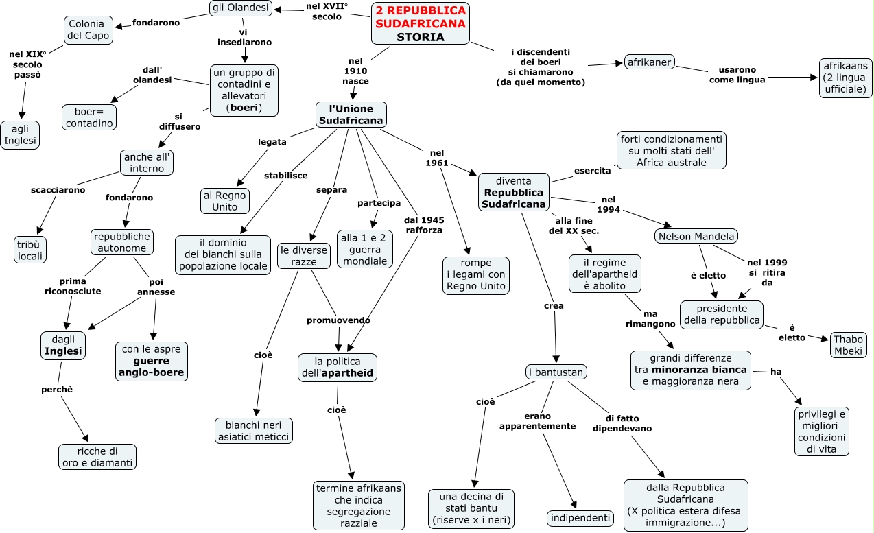 Questa Cmap, creata con IHMC CmapTools, contiene informazioni relative a: 2 REPUBBLICA SUDAFRICANA, gli Olandesi fondarono Colonia del Capo, grandi differenze tra minoranza bianca e maggioranza nera ha privilegi e migliori condizioni di vita, un gruppo di contadini e allevatori (boeri) si diffusero anche all' interno, repubbliche autonome prima riconosciute dagli Inglesi, l'Unione Sudafricana separa le diverse razze, diventa Repubblica Sudafricana nel 1994 Nelson Mandela, repubbliche autonome poi annesse con le aspre guerre anglo-boere, le diverse razze promuovendo la politica dell'apartheid, il regime dell'apartheid è abolito ma rimangono grandi differenze tra minoranza bianca e maggioranza nera, Nelson Mandela è eletto presidente della repubblica, i bantustan erano apparentemente indipendenti, l'Unione Sudafricana stabilisce il dominio dei bianchi sulla popolazione locale, anche all' interno scacciarono tribù locali, diventa Repubblica Sudafricana crea i bantustan, presidente della repubblica è eletto Thabo Mbeki, l'Unione Sudafricana legata al Regno Unito, repubbliche autonome poi annesse dagli Inglesi, l'Unione Sudafricana partecipa alla 1 e 2 guerra mondiale, la politica dell'apartheid cioè termine afrikaans che indica segregazione razziale, gli Olandesi vi insediarono un gruppo di contadini e allevatori (boeri)