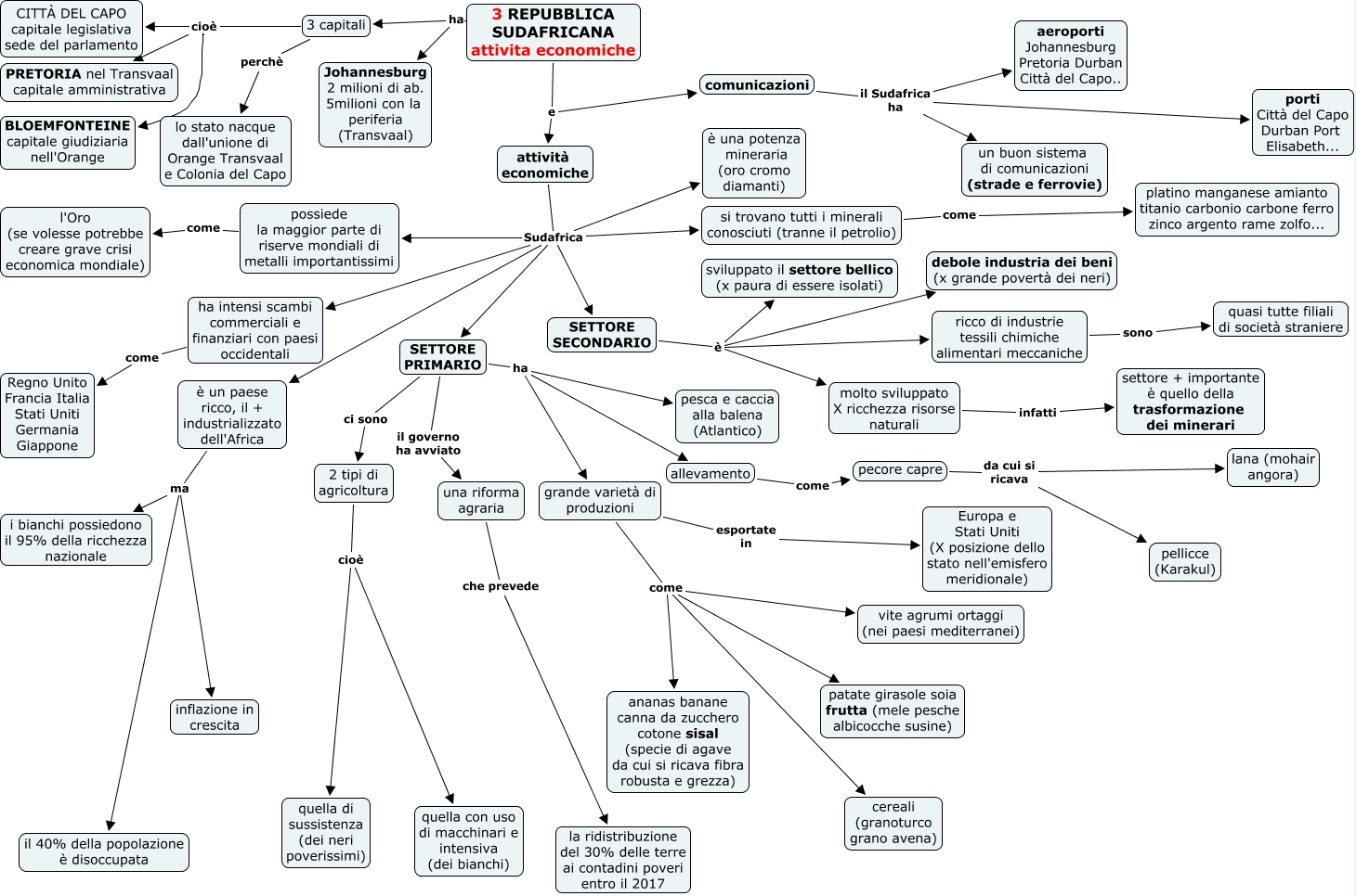 Questa Cmap, creata con IHMC CmapTools, contiene informazioni relative a: 4 REPUBBLICA SUDAFRICANA attivita economiche, molto sviluppato X ricchezza risorse naturali infatti settore + importante è quello della trasformazione dei minerari, comunicazioni il Sudafrica ha un buon sistema di comunicazioni (strade e ferrovie), ricco di industrie tessili chimiche alimentari meccaniche sono quasi tutte filiali di società straniere, una riforma agraria che prevede la ridistribuzione del 30% delle terre ai contadini poveri entro il 2017, SETTORE SECONDARIO è ricco di industrie tessili chimiche alimentari meccaniche, SETTORE PRIMARIO ci sono 2 tipi di agricoltura, SETTORE SECONDARIO è debole industria dei beni (x grande povertà dei neri), attività economiche Sudafrica possiede la maggior parte di riserve mondiali di metalli importantissimi, grande varietà di produzioni esportate in Europa e Stati Uniti (X posizione dello stato nell'emisfero meridionale), pecore capre da cui si ricava lana (mohair angora), 3 capitali cioè BLOEMFONTEINE capitale giudiziaria nell'Orange, attività economiche Sudafrica si trovano tutti i minerali conosciuti (tranne il petrolio), 3 REPUBBLICA SUDAFRICANA attivita economiche ha 3 capitali, 2 tipi di agricoltura cioè quella con uso di macchinari e intensiva (dei bianchi), attività economiche Sudafrica è un paese ricco, il + industrializzato dell'Africa, grande varietà di produzioni come ananas banane canna da zucchero cotone sisal (specie di agave da cui si ricava fibra robusta e grezza), 2 tipi di agricoltura cioè quella di sussistenza (dei neri poverissimi), grande varietà di produzioni come cereali (granoturco grano avena), grande varietà di produzioni come patate girasole soia frutta (mele pesche albicocche susine), comunicazioni il Sudafrica ha porti Città del Capo Durban Port Elisabeth...