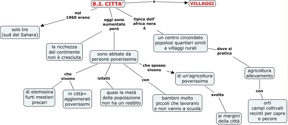 Questa Cmap, creata con IHMC CmapTools, contiene informazioni relative a: 8.2. CITTA' E VILLAGGI, 8.2. CITTA' tipica dell' africa nera è un centro circondato popolosi quartieri simili a villaggi rurali, agricoltura allevamento con orti campi coltivati recinti per capre e pecore, 8.2. CITTA' e VILLAGGI, sono abitate da persone poverissime con bambini molto piccoli che lavorano e non vanno a scuola, 8.2. CITTA' nel 1960 erano solo tre (sud del Sahara), sono abitate da persone poverissime che vivono in città= agglomerati poverissimi, sono abitate da persone poverissime che spesso vivono di un'agricoltura poverissima, un centro circondato popolosi quartieri simili a villaggi rurali dove si pratica agricoltura allevamento, sono abitate da persone poverissime infatti quasi la metà della popolazione non ha un reddito, 8.2. CITTA' oggi sono aumentate però la ricchezza del continente non è cresciuta, sono abitate da persone poverissime che vivono di elemosina furti mestieri precari, di un'agricoltura poverissima svolta ai margini della città, 8.2. CITTA' oggi sono aumentate però sono abitate da persone poverissime
