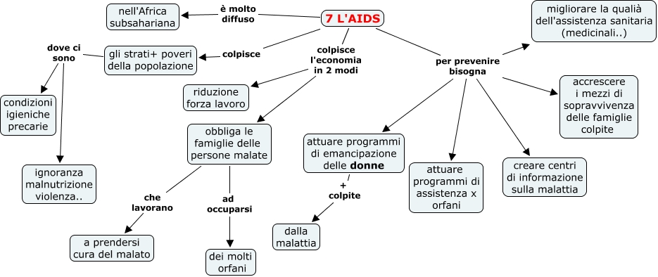 Questa Cmap, creata con IHMC CmapTools, contiene informazioni relative a: 7 L'AIDS, 7 L'AIDS per prevenire bisogna migliorare la qualià dell'assistenza sanitaria (medicinali..), 7 L'AIDS per prevenire bisogna creare centri di informazione sulla malattia, 7 L'AIDS colpisce l'economia in 2 modi obbliga le famiglie delle persone malate, gli strati+ poveri della popolazione dove ci sono ignoranza malnutrizione violenza.., 7 L'AIDS per prevenire bisogna attuare programmi di assistenza x orfani, gli strati+ poveri della popolazione dove ci sono condizioni igieniche precarie, obbliga le famiglie delle persone malate ad occuparsi dei molti orfani, 7 L'AIDS colpisce gli strati+ poveri della popolazione, attuare programmi di emancipazione delle donne + colpite dalla malattia, obbliga le famiglie delle persone malate che lavorano a prendersi cura del malato, 7 L'AIDS per prevenire bisogna accrescere i mezzi di sopravvivenza delle famiglie colpite, 7 L'AIDS colpisce l'economia in 2 modi riduzione forza lavoro, 7 L'AIDS è molto diffuso nell'Africa subsahariana, 7 L'AIDS per prevenire bisogna attuare programmi di emancipazione delle donne