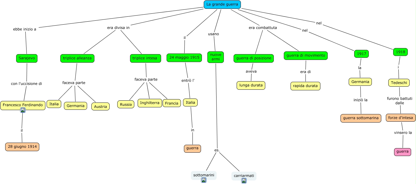 Questa Cmap, creata con IHMC CmapTools, contiene informazioni relative a: la grande guerra, La grande guerra nel 1917, La grande guerra era divisa in triplice alleanza, La grande guerra ebbe inizio a Sarajevo, forze d'intesa vinsero la guerra, 24 maggio 1915 entrò l' Italia, triplice alleanza faceva parte Italia, La grande guerra nel 1918, Sarajevo con l'uccisione di Francesco Ferdinando, guerra di posizione aveva lunga durata, triplice alleanza faceva parte Austria, triplice intesa faceva parte Inghilterra, La grande guerra era combattuta guerra di movimento, guerra di movimento era di rapida durata, La grande guerra il 24 maggio 1915, Germania iniziò la guerra sottomarina, triplice intesa faceva parte Russia, La grande guerra era combattuta guerra di posizione, La grande guerra usano nuove armi, nuove armi es. sottomarini, Tedeschi furono battuti dalle forze d'intesa