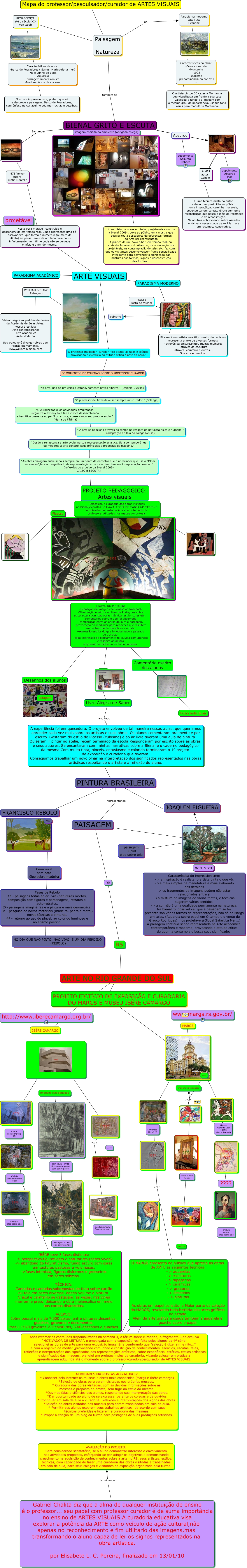 Esse mapa conceitual, produzido no IHMC CmapTools, tem a informação relacionada a: PROFESSOR PESQUISADOR CURADOR de ARTES VISUAIS III, projetável ???? ARTE VISUAIS, PARADIGMA MODERNO ???? cubismo, paisagem 30/40 óleo sobre tela ???? ????, Picasso Rosto de mulher ???? ????, depoimento Absurdo Cabaré ???? Absurdo, ???? ???? ????, depoimento Absurdo Mar ???? ????, ???? ???? ETAPAS DO PROJETO: -Exposição de imagens de Picasso no Notebook -Observação e leitura no livro de Portugues sobre as características das obras: técnica, estilo, cores,etc... -comentários sobre o que foi observado, -comparação entre as obras do livro e notebook, -provocação do mediador para reflexões que resultem em conhecimento das obras e artista, -expressão escrita do que foi observado e passado pelo artista. ( cada expressão de pensamento foi ouvida com atenção e respeito ao aluno) -expressão artística no estilo do cubismo., PARADIGMA ACADÊMICO ???? Bibiano segue os padrões de beleza da Academia de Belas Artes. Possui 3 estilos: -Arte contemporânea -Arte Acadêmica -Arte Moderna Seu objetivo é divulgar obras que ficarão eternamente. www,william bibiano.com, Picasso ???? ????, ???? ???? WILLIAM BIBIANO Paisagem, ???? ???? Livro Alegria de Saber, ???? ???? PROJETO FICTÍCIO DE EXPOSIÇÃO E CURADORIA DO MARGS E MUSEU IBÊRE CAMARGO, AVALIAÇÃO DO PROJETO: Será considerado satisfatório, se o aluno demonstrar interesse e envolvimento nas atividades propostas, esforçando-se por atingir os objetivos e demonstrando crescimento na aquisição de conhecimentos sobre a arte no RS, seus artistas, estilos, técnicas, com capacidade de fazer uma curadoria das obras visitadas e trabalhadas em sala de aula, para seus colegas e visitantes da exposição organizada pela turma. ???? ATIVIDADES PROPOSTAS AOS ALUNOS: * Conhecer pela internet os museus e obras mais conhecidas (Margs e Ibêre camargo) *Seleção de obras para serem visitadas nos próprios museus. * Curadoria das obras visitadas, com as devidas informações sobre as mesmas e proposta do artista, sem fugir ao estilo do mesmo. *Ouvir as falas e silêncios dos alunos, respeitando sua interpretação das obras. *Dar oportunidade ao aluno de se expressar perante os colegas e de ouvi-los * Continuar em sala de aula a curadoria, reflexões e interpretações dos signos das obras. *Seleção de obras visitadas nos museus para serem trabalhadas em sala de aula. * Permitir aos alunos exporem seus trabalhos artíticos, de acordo com suas técnicas preferidas e fazerem a curadoria das mesmas. * Propor a criação de um blog da turma para postagens de suas produções artísticas., ARTE NO RIO GRANDE DO SUL ???? IBÊRE CAMARGO, Paisagem Natureza no Paradigma moderno XIX a XX Cézanne, PINTURA BRASILEIRA ???? JOAQUIM FIGUEIRA, natureza ???? ????, Paisagem Natureza também na Num misto de obras em telas, projetáveis e outros a Bienal 2009,trouxe ao público uma mostra que possibilitou a descoberta de diferentes formas da Arte ser representada A prática de um novo olhar, em tempo real, na areia do Armazém do Absurdo, na observação dos projetáveis, na contemplação de telas,etc, fez com que os visitantes desenvolvessem "uma sensibilidade inteligente para desvendar o significado das misturas das formas, signos e desconstrução das formas..., RS ???? ARTE NO RIO GRANDE DO SUL
