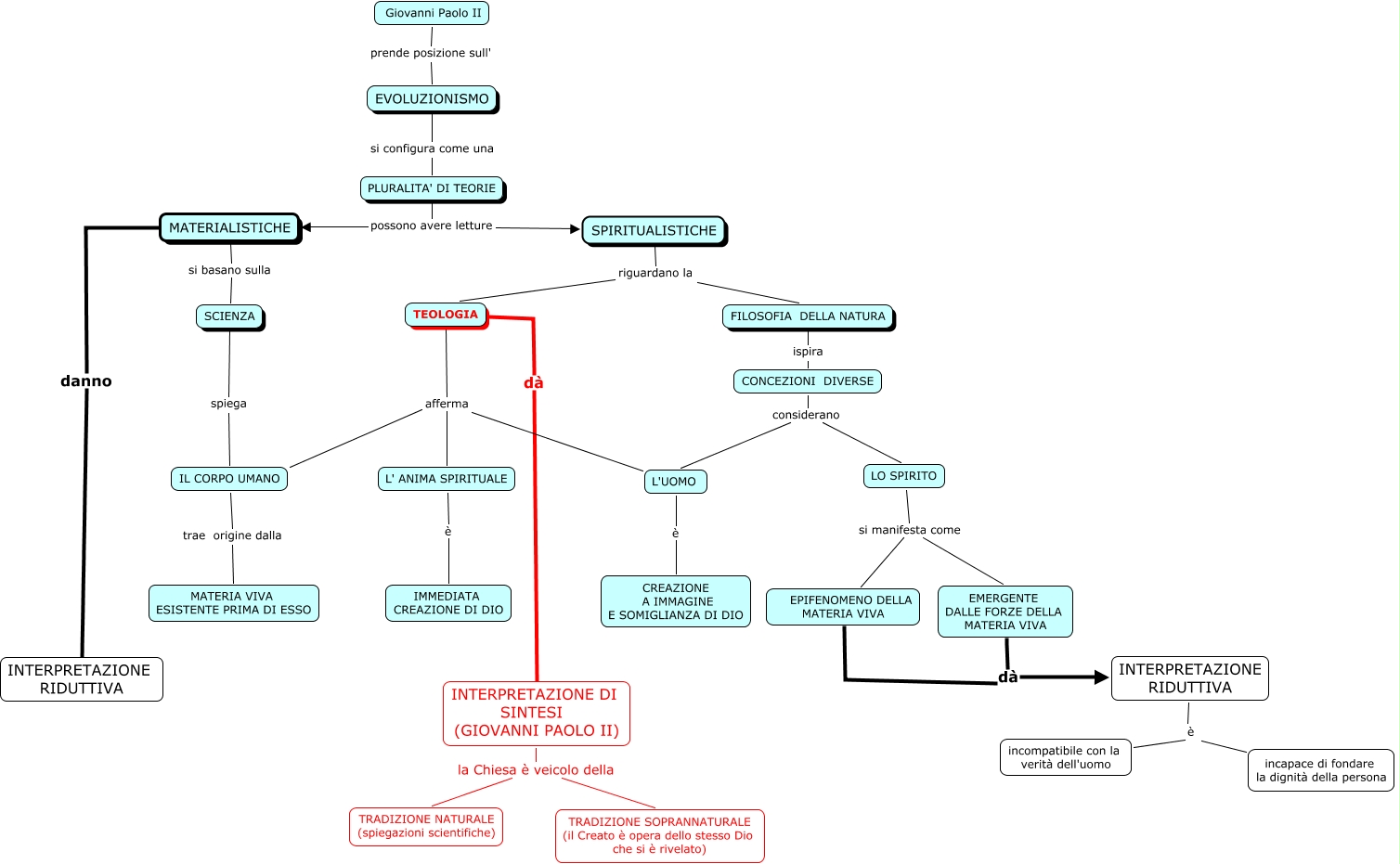 Questa Cmap, creata con IHMC CmapTools, contiene informazioni relative a: La Chiesa e l'evoluzionismo rev1_carloni, IL CORPO UMANO afferma L' ANIMA SPIRITUALE, PLURALITA' DI TEORIE possono avere letture MATERIALISTICHE, LO SPIRITO si manifesta come EPIFENOMENO DELLA MATERIA VIVA, LO SPIRITO si manifesta come EMERGENTE DALLE FORZE DELLA MATERIA VIVA, EVOLUZIONISMO si configura come una PLURALITA' DI TEORIE, INTERPRETAZIONE RIDUTTIVA è incompatibile con la verità dell'uomo, MATERIALISTICHE si basano sulla SCIENZA, IL CORPO UMANO trae origine dalla MATERIA VIVA ESISTENTE PRIMA DI ESSO, PLURALITA' DI TEORIE possono avere letture SPIRITUALISTICHE, Giovanni Paolo II prende posizione sull' EVOLUZIONISMO, IL CORPO UMANO afferma L'UOMO, L' ANIMA SPIRITUALE è IMMEDIATA CREAZIONE DI DIO, MATERIALISTICHE danno INTERPRETAZIONE RIDUTTIVA, TEOLOGIA dà INTERPRETAZIONE DI SINTESI (GIOVANNI PAOLO II), CONCEZIONI DIVERSE considerano L'UOMO, L'UOMO è CREAZIONE A IMMAGINE E SOMIGLIANZA DI DIO, INTERPRETAZIONE DI SINTESI (GIOVANNI PAOLO II) la Chiesa è veicolo della TRADIZIONE SOPRANNATURALE (il Creato è opera dello stesso Dio che si è rivelato), SPIRITUALISTICHE riguardano la TEOLOGIA, IL CORPO UMANO afferma TEOLOGIA, EPIFENOMENO DELLA MATERIA VIVA dà INTERPRETAZIONE RIDUTTIVA