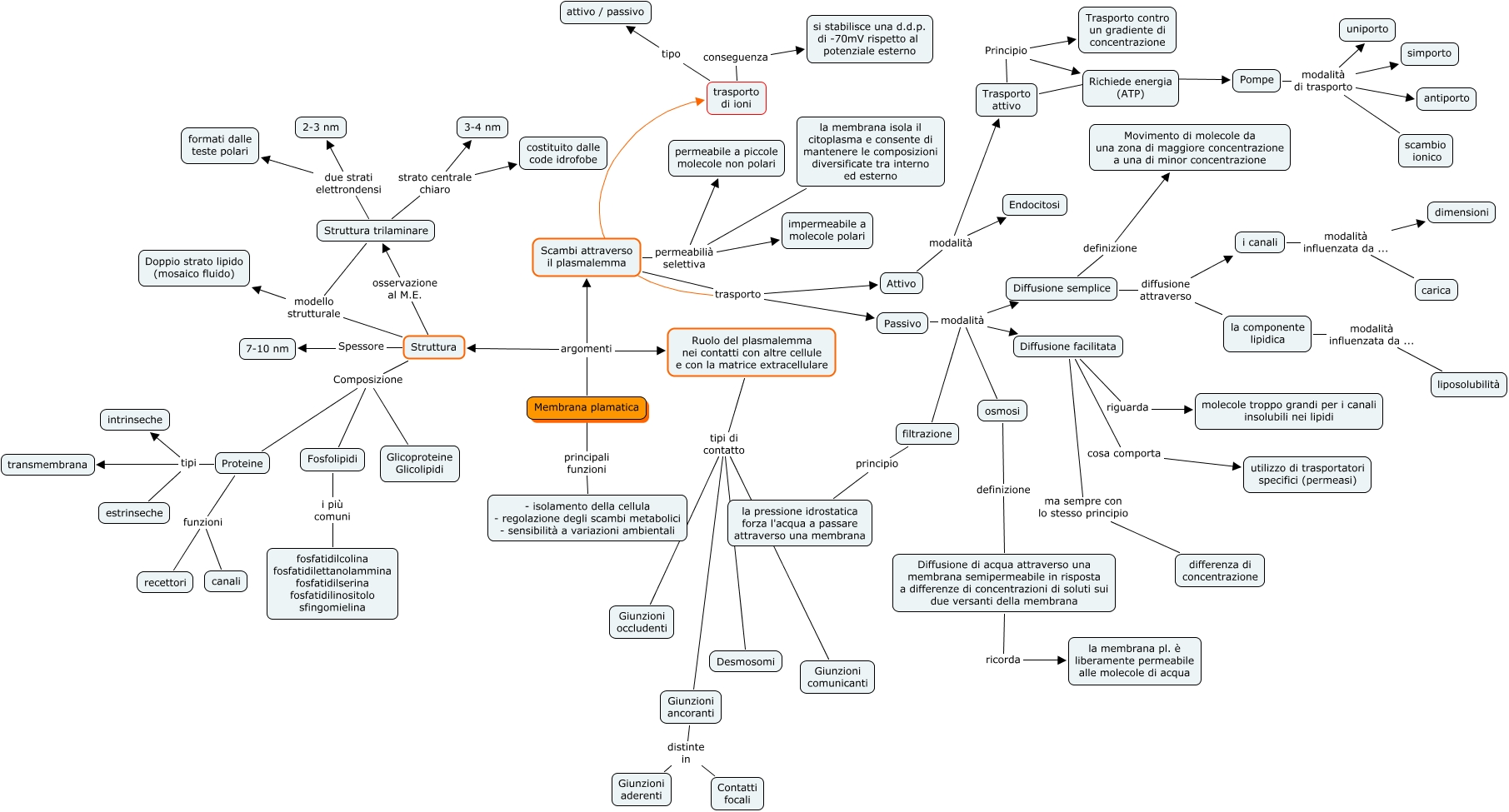 Questa Cmap, creata con IHMC CmapTools, contiene informazioni relative a: Membrana plasmatica, Ruolo del plasmalemma nei contatti con altre cellule e con la matrice extracellulare tipi di contatto Giunzioni comunicanti, Struttura Composizione Fosfolipidi, Ruolo del plasmalemma nei contatti con altre cellule e con la matrice extracellulare tipi di contatto Desmosomi, osmosi definizione Diffusione di acqua attraverso una membrana semipermeabile in risposta a differenze di concentrazioni di soluti sui due versanti della membrana, filtrazione principio la pressione idrostatica forza l'acqua a passare attraverso una membrana, Trasporto attivo Principio Trasporto contro un gradiente di concentrazione, la componente lipidica modalità influenzata da ... liposolubilità, Membrana plamatica argomenti Struttura, Giunzioni ancoranti distinte in Contatti focali, la membrana isola il citoplasma e consente di mantenere le composizioni diversificate tra interno ed esterno permeabilià selettiva permeabile a piccole molecole non polari, Attivo modalità Endocitosi, Passivo modalità osmosi, Pompe modalità di trasporto simporto, Passivo modalità filtrazione, Giunzioni ancoranti distinte in Giunzioni aderenti, Diffusione semplice definizione Movimento di molecole da una zona di maggiore concentrazione a una di minor concentrazione, Scambi attraverso il plasmalemma trasporto Attivo, Diffusione semplice diffusione attraverso i canali, Struttura trilaminare due strati elettrondensi 2-3 nm, Diffusione facilitata cosa comporta utilizzo di trasportatori specifici (permeasi)