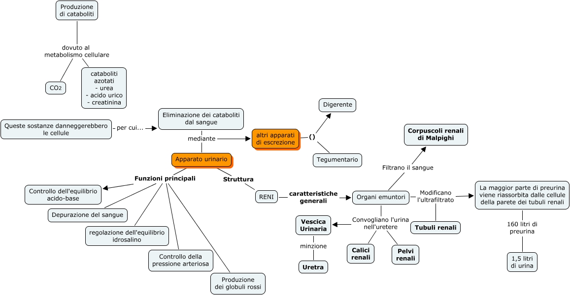 Questa Cmap, creata con IHMC CmapTools, contiene informazioni relative a: Apparato urinario, Apparato urinario Funzioni principali Depurazione del sangue, Produzione di cataboliti dovuto al metabolismo cellulare cataboliti azotati - urea - acido urico - creatinina, altri apparati di escrezione () Tegumentario, RENI caratteristiche generali Organi emuntori, Apparato urinario Funzioni principali Controllo della pressione arteriosa, La maggior parte di preurina viene riassorbita dalle cellule della parete dei tubuli renali 160 litri di preurina 1,5 litri di urina, Eliminazione dei cataboliti dal sangue mediante altri apparati di escrezione, Organi emuntori Modificano l'ultrafiltrato Tubuli renali, Organi emuntori Convogliano l'urina nell'uretere Pelvi renali, Eliminazione dei cataboliti dal sangue mediante Apparato urinario, Apparato urinario Struttura RENI, Organi emuntori Convogliano l'urina nell'uretere Calici renali, altri apparati di escrezione () Digerente, Apparato urinario Funzioni principali regolazione dell'equilibrio idrosalino, Vescica Urinaria minzione Uretra, Apparato urinario Funzioni principali Produzione dei globuli rossi, Produzione di cataboliti dovuto al metabolismo cellulare CO2, Apparato urinario Funzioni principali Controllo dell'equilibrio acido-base, Organi emuntori Modificano l'ultrafiltrato La maggior parte di preurina viene riassorbita dalle cellule della parete dei tubuli renali, Queste sostanze danneggerebbero le cellule per cui... Eliminazione dei cataboliti dal sangue