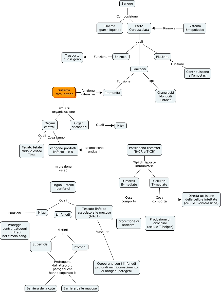 Questa Cmap, creata con IHMC CmapTools, contiene informazioni relative a: Sistema immunitario, Laucociti Funzione Immunità, Organi linfoidi periferici Quali Linfonodi, Sistema Immunitario Livelli si organizzazione Organi centrali, Organi linfoidi periferici Quali Tessuto linfoide associato alle mucose (MALT), Piastrine Funzioni Contribuiscono all'emostasi, Sistema Emopoietico Rinnova Parte Corpuscolata, Superficiali Proteggono dall'attacco di patogeni che hanno superato la Barriera della cute, Profondi Proteggono dall'attacco di patogeni che hanno superato la Barriera della cute, Superficiali Proteggono dall'attacco di patogeni che hanno superato la Barriera delle mucose, Organi linfoidi periferici Quali Milza, Organi secondari Quali Milza, Sangue Composizione Plasma (parte liquida), Sistema Immunitario funzione difensiva Immunità, Cellulari T-mediate Cosa comporta Produzione di citochine (cellule T-helper), Possiedono recettori (B-CR e T-CR) Tipi di risposte immunitarie Cellulari T-mediate, Sistema Immunitario Livelli si organizzazione Organi secondari, Cellulari T-mediate Cosa comporta Diretta uccisione delle cellule infettate (cellule T-citotossiche), vengono prodotti linfociti T e B migrazione verso Organi linfoidi periferici, Linfonodi distinti in Superficiali, Milza Funzioni Protegge contro patogeni infiltrati nel circolo sang.