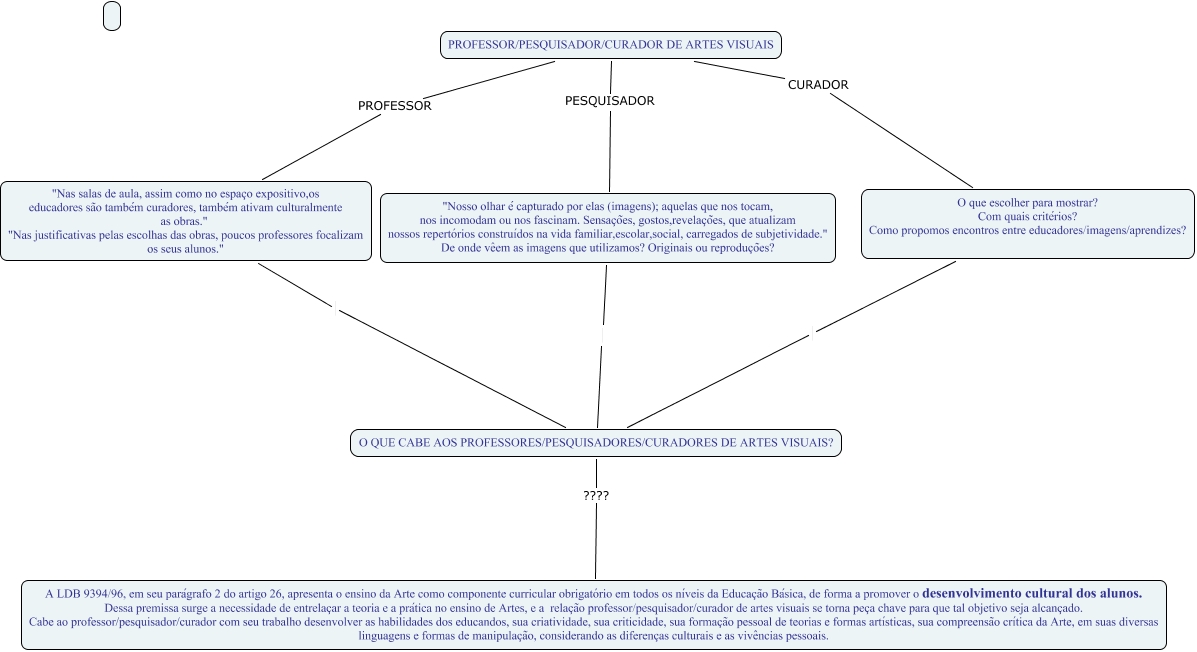 Esse mapa conceitual, produzido no IHMC CmapTools, tem a informação relacionada a: Professor,pesquisador,curador de artes visuais, PROFESSOR/PESQUISADOR/CURADOR DE ARTES VISUAIS PESQUISADOR "Nosso olhar é capturado por elas (imagens); aquelas que nos tocam, nos incomodam ou nos fascinam. Sensações, gostos,revelações, que atualizam nossos repertórios construídos na vida familiar,escolar,social, carregados de subjetividade." De onde vêem as imagens que utilizamos? Originais ou reproduções?, O QUE CABE AOS PROFESSORES/PESQUISADORES/CURADORES DE ARTES VISUAIS? ???? A LDB 9394/96, em seu parágrafo 2 do artigo 26, apresenta o ensino da Arte como componente curricular obrigatório em todos os níveis da Educação Básica, de forma a promover o desenvolvimento cultural dos alunos. Dessa premissa surge a necessidade de entrelaçar a teoria e a prática no ensino de Artes, e a relação professor/pesquisador/curador de artes visuais se torna peça chave para que tal objetivo seja alcançado. Cabe ao professor/pesquisador/curador com seu trabalho desenvolver as habilidades dos educandos, sua criatividade, sua criticidade, sua formação pessoal de teorias e formas artísticas, sua compreensão crítica da Arte, em suas diversas linguagens e formas de manipulação, considerando as diferenças culturais e as vivências pessoais., O que escolher para mostrar? Com quais critérios? Como propomos encontros entre educadores/imagens/aprendizes? O QUE CABE AOS PROFESSORES/PESQUISADORES/CURADORES DE ARTES VISUAIS?, "Nas salas de aula, assim como no espaço expositivo,os educadores são também curadores, também ativam culturalmente as obras." "Nas justificativas pelas escolhas das obras, poucos professores focalizam os seus alunos." O QUE CABE AOS PROFESSORES/PESQUISADORES/CURADORES DE ARTES VISUAIS?, PROFESSOR/PESQUISADOR/CURADOR DE ARTES VISUAIS CURADOR O que escolher para mostrar? Com quais critérios? Como propomos encontros entre educadores/imagens/aprendizes?, PROFESSOR/PESQUISADOR/CURADOR DE ARTES VISUAIS PROFESSOR "Nas salas de aula, assim como no espaço expositivo,os educadores são também curadores, também ativam culturalmente as obras." "Nas justificativas pelas escolhas das obras, poucos professores focalizam os seus alunos.", "Nosso olhar é capturado por elas (imagens); aquelas que nos tocam, nos incomodam ou nos fascinam. Sensações, gostos,revelações, que atualizam nossos repertórios construídos na vida familiar,escolar,social, carregados de subjetividade." De onde vêem as imagens que utilizamos? Originais ou reproduções? O QUE CABE AOS PROFESSORES/PESQUISADORES/CURADORES DE ARTES VISUAIS?
