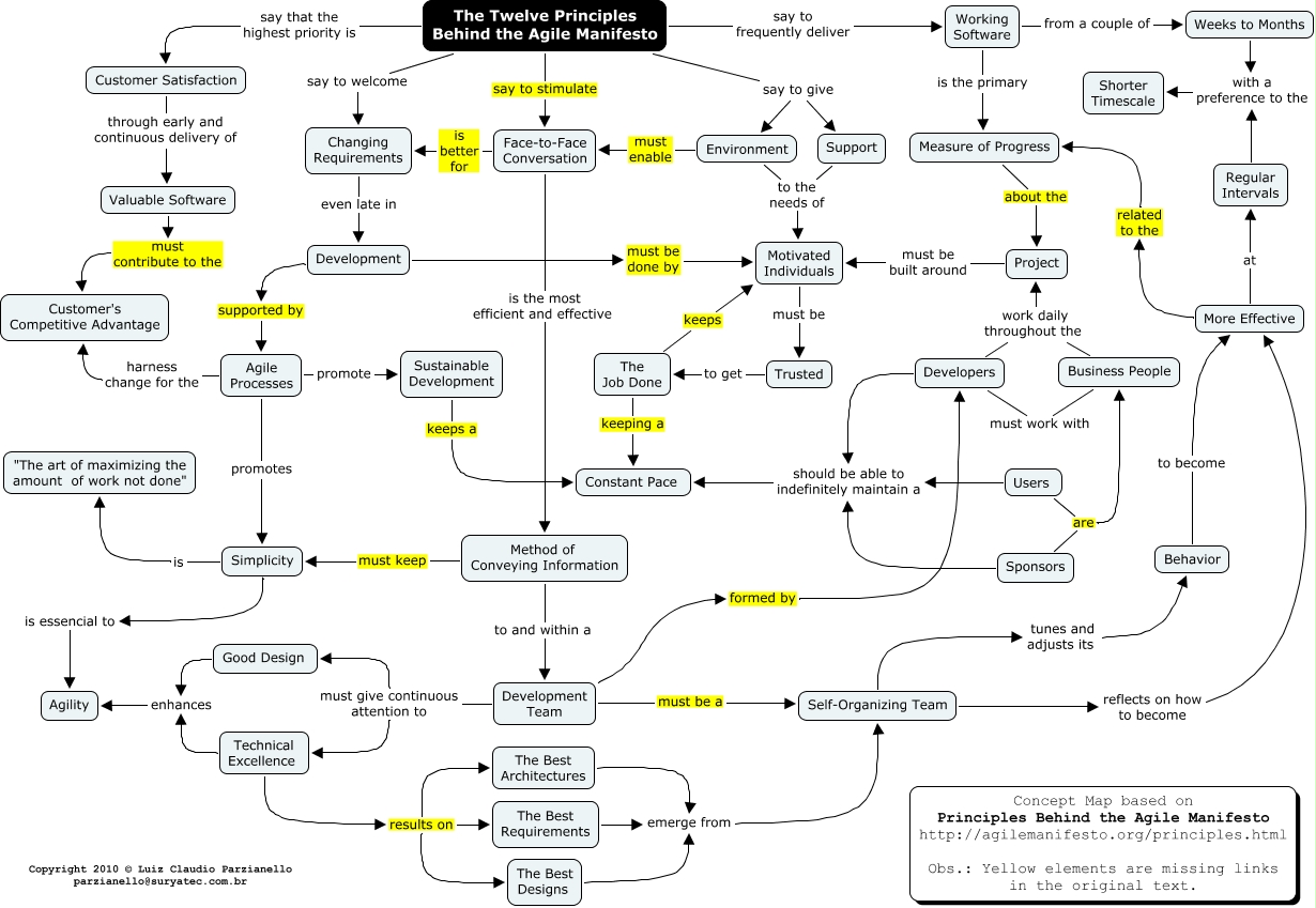 Esse mapa conceitual, produzido no IHMC CmapTools, tem a informação relacionada a: The Twelve Principles Behind the Agile Manifesto, Working Software is the primary Measure of Progress, Users are Business People, Behavior to become More Effective, Trusted to get The Job Done, Technical Excellence results on The Best Requirements, Business People work daily throughout the Project, Development Team must be a Self-Organizing Team, Self-Organizing Team tunes and adjusts its Behavior, The Best Designs emerge from Self-Organizing Team, Working Software from a couple of Weeks to Months, Developers work daily throughout the Project, Development Team must give continuous attention to Technical Excellence, Simplicity is "The art of maximizing the amount of work not done", Sustainable Development keeps a Constant Pace, Environment must enable Face-to-Face Conversation, The Twelve Principles Behind the Agile Manifesto say to frequently deliver Working Software, Project must be built around Motivated Individuals, More Effective related to the Measure of Progress, Technical Excellence results on The Best Architectures, The Job Done keeping a Constant Pace