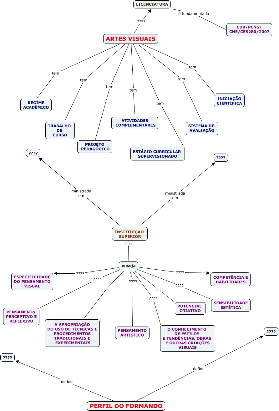 Esse mapa conceitual, produzido no IHMC CmapTools, tem a informação relacionada a: MAPA 1 CURRICULO DE UM CURSO DE ARTES VISUAIS, ARTES VISUAIS tem ATIVIDADES COMPLEMENTARES, enseja ???? ESPECIFICIDADE DO PENSAMENTO VISUAL, ARTES VISUAIS tem ESTÁGIO CURRICULAR SUPERVISIONADO, ARTES VISUAIS ???? LICENCIATURA, enseja A APROPRIAÇÃO DO USO DE TÉCNICAS E PROCEDIMENTOS TRADICIONAIS E EXPERIMENTAIS, INSTITUIÇÃO SUPERIOR ???? enseja, ARTES VISUAIS tem SISTEMA DE AVALIAÇÃO, INSTITUIÇÃO SUPERIOR ministrada em ????, PERFIL DO FORMANDO define ????, INSTITUIÇÃO SUPERIOR ministrada em ????, ARTES VISUAIS tem PROJETO PEDAGÓGICO, enseja ???? O CONHECIMENTO DE ESTILOS E TENDÊNCIAS, OBRAS E OUTRAS CRIAÇÕES VISUAIS, enseja ???? PENSAMENTo PERCEPTIVO E REFLEXIVO, enseja ???? COMPETÊNCIA E HABILIDADES, ARTES VISUAIS tem INICIAÇÃO CIENTÍFICA, ARTES VISUAIS tem TRABALHO DE CURSO, ARTES VISUAIS tem REGIME ACADÊMICO, LICENCIATURA é fundamentada LDB/PCNS/ CNE/CES280/2007, enseja ???? SENSIBILIDADE ESTÉTICA, enseja ???? PENSAMENTO ARTÍSTICO