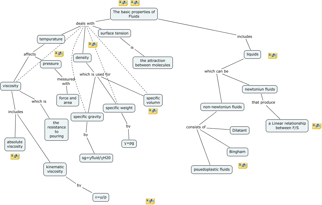 This Concept Map, created with IHMC CmapTools, has information related to: topic1, non-newtoniun fluids consists of psuedoplastic fluids, non-newtoniun fluids consists of Bingham, specific weight by γ=pg, The basic properties of Fluids deals with tempurature, pressure messured with force and area, kinematic viscosity by υ=μ/p, The basic properties of Fluids deals with surface tension, The basic properties of Fluids deals with viscosity, tempurature affects viscosity, viscosity which is the resistance to pouring, liquids which can be non-newtoniun fluids, The basic properties of Fluids includes liquids, non-newtoniun fluids consists of Dilatant, viscosity includes kinematic viscosity, density which is used for specific weight, surface tension is the attraction between molecules, density which is used for specific gravity, The basic properties of Fluids deals with density, density which is used for specific volumn, viscosity includes absolute viscosity