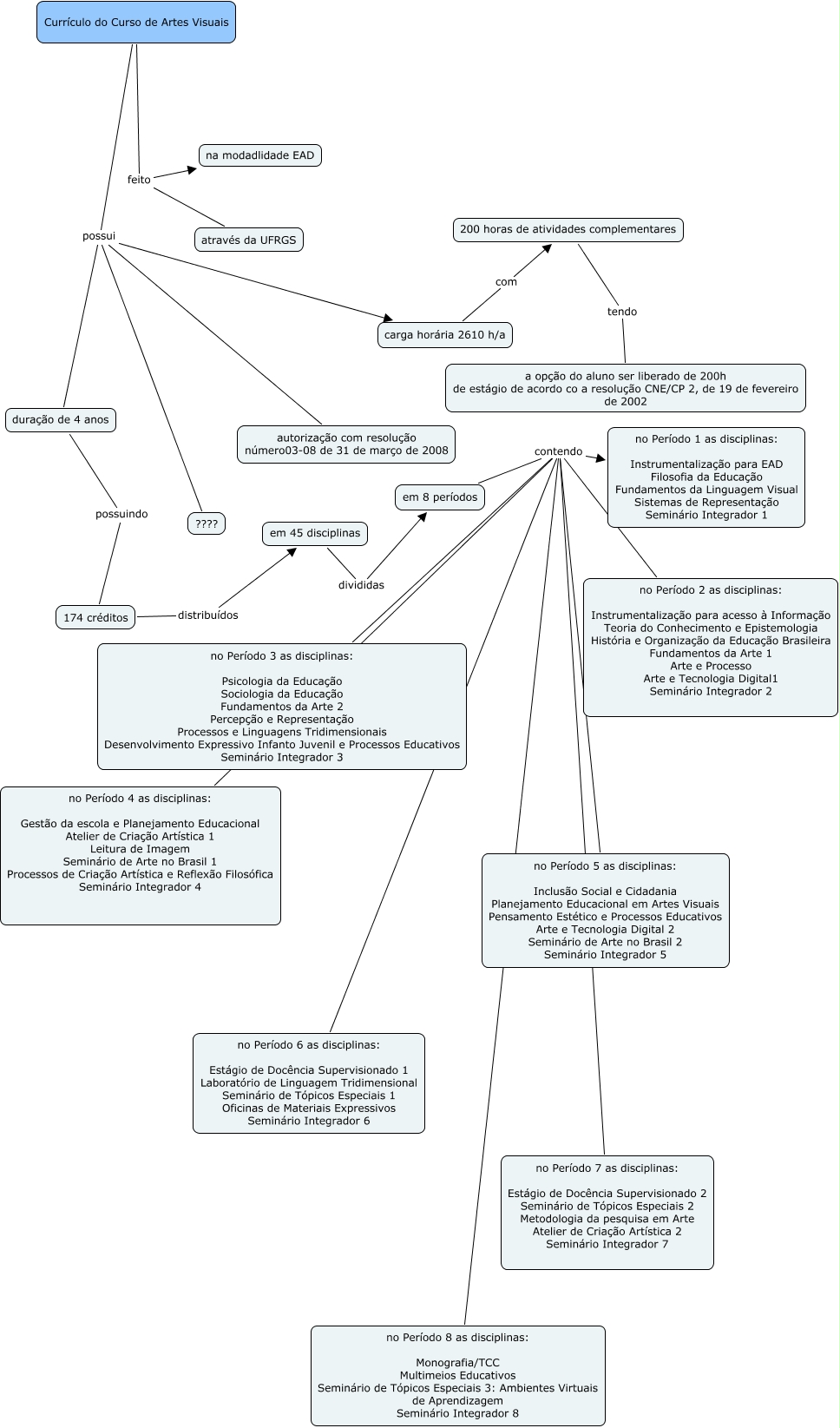 Esse mapa conceitual, produzido no IHMC CmapTools, tem a informação relacionada a: Currículo do Curso de Artes Visuais, em 8 períodos contendo no Período 4 as disciplinas: Gestão da escola e Planejamento Educacional Atelier de Criação Artística 1 Leitura de Imagem Seminário de Arte no Brasil 1 Processos de Criação Artística e Reflexão Filosófica Seminário Integrador 4, Currículo do Curso de Artes Visuais feito na modadlidade EAD, em 8 períodos contendo no Período 1 as disciplinas: Instrumentalização para EAD Filosofia da Educação Fundamentos da Linguagem Visual Sistemas de Representação Seminário Integrador 1, Currículo do Curso de Artes Visuais feito através da UFRGS, em 8 períodos contendo no Período 7 as disciplinas: Estágio de Docência Supervisionado 2 Seminário de Tópicos Especiais 2 Metodologia da pesquisa em Arte Atelier de Criação Artística 2 Seminário Integrador 7, Currículo do Curso de Artes Visuais possui duração de 4 anos, em 8 períodos contendo no Período 8 as disciplinas: Monografia/TCC Multimeios Educativos Seminário de Tópicos Especiais 3: Ambientes Virtuais de Aprendizagem Seminário Integrador 8, em 8 períodos contendo no Período 2 as disciplinas: Instrumentalização para acesso à Informação Teoria do Conhecimento e Epistemologia História e Organização da Educação Brasileira Fundamentos da Arte 1 Arte e Processo Arte e Tecnologia Digital1 Seminário Integrador 2, em 8 períodos contendo no Período 6 as disciplinas: Estágio de Docência Supervisionado 1 Laboratório de Linguagem Tridimensional Seminário de Tópicos Especiais 1 Oficinas de Materiais Expressivos Seminário Integrador 6, em 8 períodos contendo no Período 5 as disciplinas: Inclusão Social e Cidadania Planejamento Educacional em Artes Visuais Pensamento Estético e Processos Educativos Arte e Tecnologia Digital 2 Seminário de Arte no Brasil 2 Seminário Integrador 5, Currículo do Curso de Artes Visuais possui autorização com resolução número03-08 de 31 de março de 2008, Currículo do Curso de Artes Visuais possui carga horária 2610 h/a, Currículo do Curso de Artes Visuais possui ????, duração de 4 anos possuindo 174 créditos, 174 créditos distribuídos em 45 disciplinas, carga horária 2610 h/a com 200 horas de atividades complementares, em 45 disciplinas divididas em 8 períodos, 200 horas de atividades complementares tendo a opção do aluno ser liberado de 200h de estágio de acordo co a resolução CNE/CP 2, de 19 de fevereiro de 2002, em 8 períodos contendo no Período 3 as disciplinas: Psicologia da Educação Sociologia da Educação Fundamentos da Arte 2 Percepção e Representação Processos e Linguagens Tridimensionais Desenvolvimento Expressivo Infanto Juvenil e Processos Educativos Seminário Integrador 3
