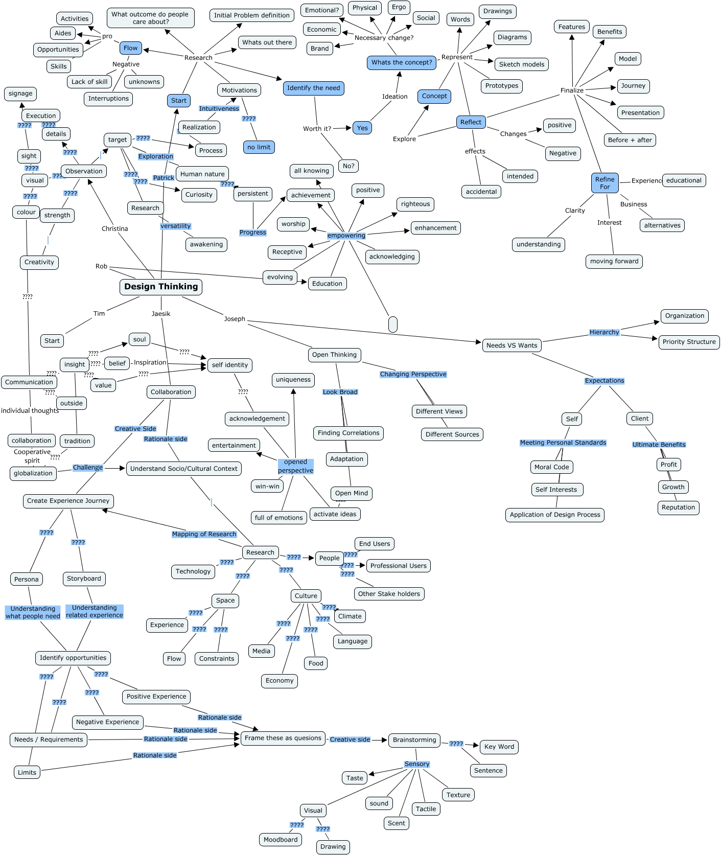 This Concept Map, created with IHMC CmapTools, has information related to: Design thinking, Open Thinking Changing Perspective Different Sources, Identify opportunities ???? Needs / Requirements, Whats the concept? Represent Prototypes, Client Ultimate Benefits Growth, Concept Represent Prototypes, Whats the concept? Necessary change? Brand, visual ???? sight, Observation target, Refine For Interest moving forward, Self Meeting Personal Standards Application of Design Process, Research ???? Technology, Motivations ???? no limit, People ???? Other Stake holders, details ???? Execution, Design Thinking Joseph Open Thinking, globalization Challenge Understand Socio/Cultural Context, Reflect Changes positive, Process ???? Realization, Culture ???? Climate, Identify opportunities ???? Limits