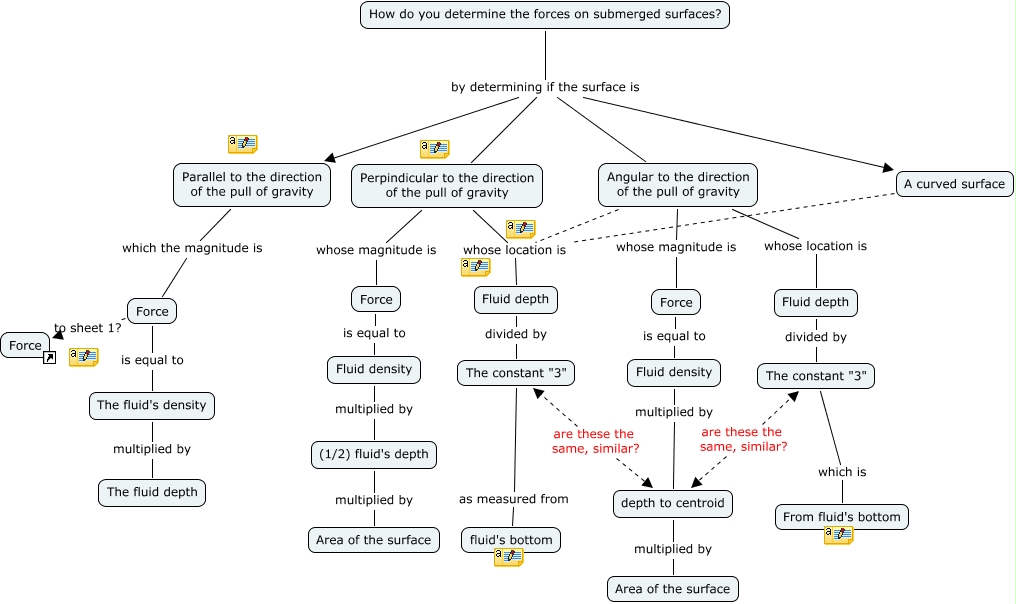 This Concept Map, created with IHMC CmapTools, has information related to: Submerged surfaces, Perpindicular to the direction of the pull of gravity whose magnitude is Force, Fluid depth divided by The constant "3", The constant "3" as measured from fluid's bottom, Fluid density multiplied by depth to centroid, Fluid density multiplied by (1/2) fluid's depth, Force to sheet 1? Force, A curved surface whose location is Fluid depth, Angular to the direction of the pull of gravity whose location is Fluid depth, Angular to the direction of the pull of gravity whose magnitude is Force, The constant "3" which is From fluid's bottom, Force is equal to Fluid density, Force is equal to The fluid's density, How do you determine the forces on submerged surfaces? by determining if the surface is A curved surface, Fluid depth divided by The constant "3", depth to centroid multiplied by Area of the surface, How do you determine the forces on submerged surfaces? by determining if the surface is Parallel to the direction of the pull of gravity, Force is equal to Fluid density, Perpindicular to the direction of the pull of gravity whose location is Fluid depth, Parallel to the direction of the pull of gravity which the magnitude is Force, How do you determine the forces on submerged surfaces? by determining if the surface is Perpindicular to the direction of the pull of gravity