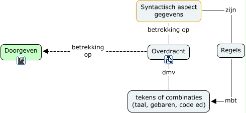 Deze Concept Map heeft informatie gerelateerd aan: Syntactisch aspect gegeven, Overdracht dmv tekens of combinaties (taal, gebaren, code ed), Regels mbt tekens of combinaties (taal, gebaren, code ed), Overdracht betrekking op Doorgeven, Syntactisch aspect gegevens zijn Regels, Syntactisch aspect gegevens betrekking op Overdracht