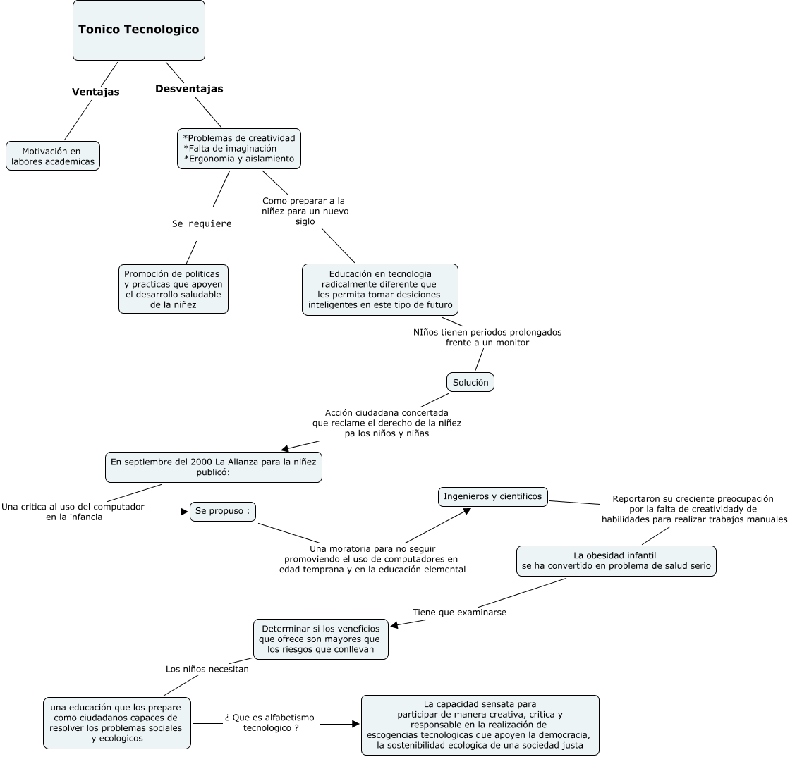 Este Cmap, tiene información relacionada con: Tónico Tecnologico Rox, En septiembre del 2000 La Alianza para la niñez publicó: Una critica al uso del computador en la infancia Se propuso :, *Problemas de creatividad *Falta de imaginación *Ergonomia y aislamiento Se requiere Promoción de politicas y practicas que apoyen el desarrollo saludable de la niñez, La obesidad infantil se ha convertido en problema de salud serio Tiene que examinarse Determinar si los veneficios que ofrece son mayores que los riesgos que conllevan, Tonico Tecnologico Desventajas *Problemas de creatividad *Falta de imaginación *Ergonomia y aislamiento, Tonico Tecnologico Ventajas Motivación en labores academicas, Se propuso : Una moratoria para no seguir promoviendo el uso de computadores en edad temprana y en la educación elemental Ingenieros y cientificos, *Problemas de creatividad *Falta de imaginación *Ergonomia y aislamiento Como preparar a la niñez para un nuevo siglo Educación en tecnologia radicalmente diferente que les permita tomar desiciones inteligentes en este tipo de futuro, Educación en tecnologia radicalmente diferente que les permita tomar desiciones inteligentes en este tipo de futuro NIños tienen periodos prolongados frente a un monitor Solución, Solución Acción ciudadana concertada que reclame el derecho de la niñez pa los niños y niñas En septiembre del 2000 La Alianza para la niñez publicó:, una educación que los prepare como ciudadanos capaces de resolver los problemas sociales y ecologicos ¿ Que es alfabetismo tecnologico ? La capacidad sensata para participar de manera creativa, critica y responsable en la realización de escogencias tecnologicas que apoyen la democracia, la sostenibilidad ecologica de una sociedad justa, Determinar si los veneficios que ofrece son mayores que los riesgos que conllevan Los niños necesitan una educación que los prepare como ciudadanos capaces de resolver los problemas sociales y ecologicos, Ingenieros y cientificos Reportaron su creciente preocupación por la falta de creatividady de habilidades para realizar trabajos manuales La obesidad infantil se ha convertido en problema de salud serio