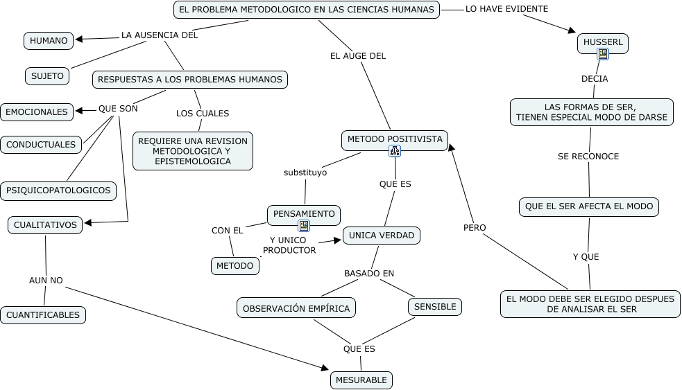 Este Cmap, tiene información relacionada con: El problema metodologico de las ciencias humanas, HUSSERL DECIA LAS FORMAS DE SER, TIENEN ESPECIAL MODO DE DARSE, LAS FORMAS DE SER, TIENEN ESPECIAL MODO DE DARSE SE RECONOCE QUE EL SER AFECTA EL MODO, METODO POSITIVISTA substituyo PENSAMIENTO, SENSIBLE QUE ES MESURABLE, PENSAMIENTO CON EL METODO, METODO POSITIVISTA QUE ES UNICA VERDAD, UNICA VERDAD BASADO EN SENSIBLE, RESPUESTAS A LOS PROBLEMAS HUMANOS LOS CUALES REQUIERE UNA REVISION METODOLOGICA Y EPISTEMOLOGICA, QUE EL SER AFECTA EL MODO Y QUE EL MODO DEBE SER ELEGIDO DESPUES DE ANALISAR EL SER, EL PROBLEMA METODOLOGICO EN LAS CIENCIAS HUMANAS LO HAVE EVIDENTE HUSSERL, UNICA VERDAD BASADO EN OBSERVACIÓN EMPÍRICA, METODO Y UNICO PRODUCTOR UNICA VERDAD, CUALITATIVOS AUN NO CUANTIFICABLES, EL PROBLEMA METODOLOGICO EN LAS CIENCIAS HUMANAS EL AUGE DEL METODO POSITIVISTA, RESPUESTAS A LOS PROBLEMAS HUMANOS QUE SON PSIQUICOPATOLOGICOS, RESPUESTAS A LOS PROBLEMAS HUMANOS QUE SON EMOCIONALES, EL PROBLEMA METODOLOGICO EN LAS CIENCIAS HUMANAS LA AUSENCIA DEL SUJETO, RESPUESTAS A LOS PROBLEMAS HUMANOS QUE SON CONDUCTUALES, RESPUESTAS A LOS PROBLEMAS HUMANOS QUE SON CUALITATIVOS, EL PROBLEMA METODOLOGICO EN LAS CIENCIAS HUMANAS LA AUSENCIA DEL RESPUESTAS A LOS PROBLEMAS HUMANOS