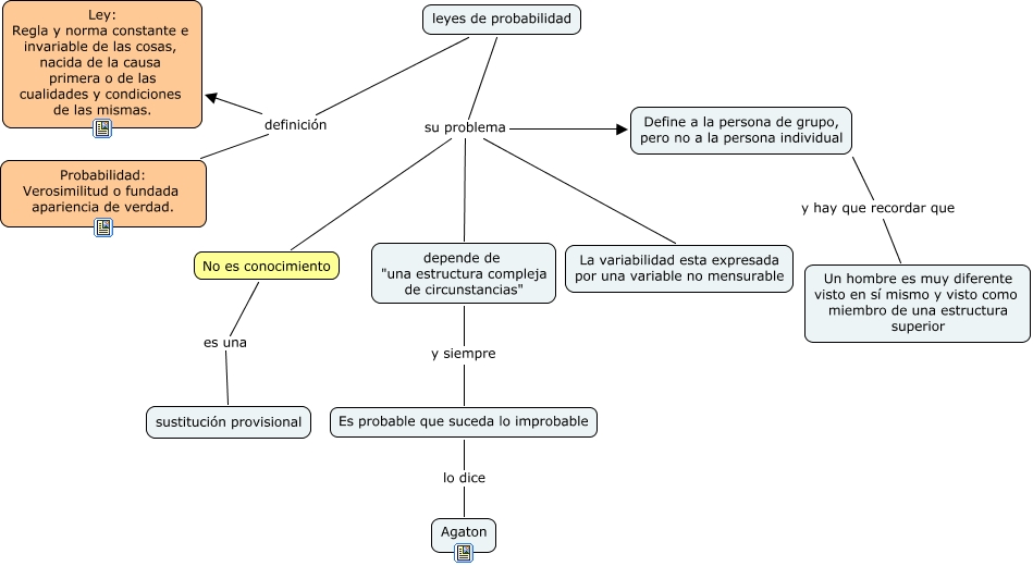 Este Cmap, tiene información relacionada con: las leyes de probabilidad son leyes a medias, leyes de probabilidad definición Ley: Regla y norma constante e invariable de las cosas, nacida de la causa primera o de las cualidades y condiciones de las mismas., leyes de probabilidad definición Probabilidad: Verosimilitud o fundada apariencia de verdad., Define a la persona de grupo, pero no a la persona individual y hay que recordar que Un hombre es muy diferente visto en sí mismo y visto como miembro de una estructura superior, Es probable que suceda lo improbable lo dice Agaton, leyes de probabilidad su problema No es conocimiento, No es conocimiento es una sustitución provisional, leyes de probabilidad su problema Define a la persona de grupo, pero no a la persona individual, depende de "una estructura compleja de circunstancias" y siempre Es probable que suceda lo improbable, leyes de probabilidad su problema La variabilidad esta expresada por una variable no mensurable, leyes de probabilidad su problema depende de "una estructura compleja de circunstancias"
