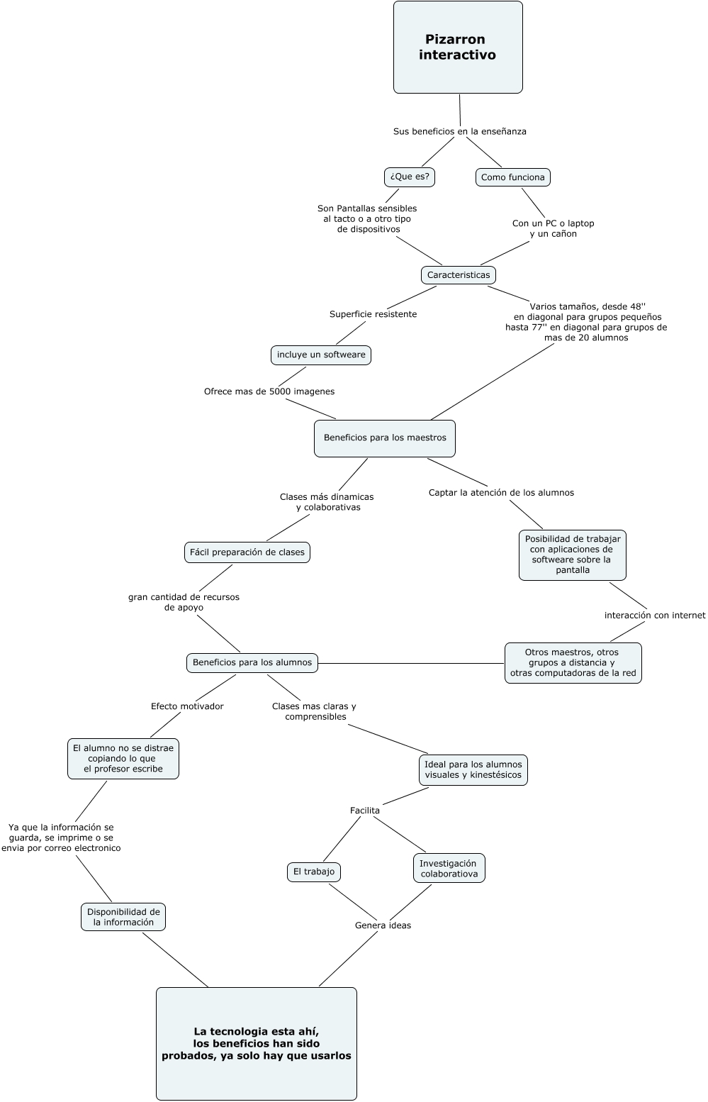 Este Cmap, tiene información relacionada con: Pizarron intel Rox, Beneficios para los maestros Captar la atención de los alumnos Posibilidad de trabajar con aplicaciones de softweare sobre la pantalla, Posibilidad de trabajar con aplicaciones de softweare sobre la pantalla interacción con internet Otros maestros, otros grupos a distancia y otras computadoras de la red, Fácil preparación de clases gran cantidad de recursos de apoyo Beneficios para los alumnos, Disponibilidad de la información ???? La tecnologia esta ahí, los beneficios han sido probados, ya solo hay que usarlos, El trabajo Genera ideas La tecnologia esta ahí, los beneficios han sido probados, ya solo hay que usarlos, Beneficios para los alumnos Efecto motivador El alumno no se distrae copiando lo que el profesor escribe, Beneficios para los alumnos Clases mas claras y comprensibles Ideal para los alumnos visuales y kinestésicos, Ideal para los alumnos visuales y kinestésicos Facilita Investigación colaboratiova, Como funciona Con un PC o laptop y un cañon Caracteristicas, Caracteristicas Superficie resistente incluye un softweare, Beneficios para los maestros Clases más dinamicas y colaborativas Fácil preparación de clases, Pizarron interactivo Sus beneficios en la enseñanza ¿Que es?, Investigación colaboratiova Genera ideas La tecnologia esta ahí, los beneficios han sido probados, ya solo hay que usarlos, Pizarron interactivo Sus beneficios en la enseñanza Como funciona, El alumno no se distrae copiando lo que el profesor escribe Ya que la información se guarda, se imprime o se envia por correo electronico Disponibilidad de la información, ¿Que es? Son Pantallas sensibles al tacto o a otro tipo de dispositivos Caracteristicas, Caracteristicas Varios tamaños, desde 48'' en diagonal para grupos pequeños hasta 77'' en diagonal para grupos de mas de 20 alumnos ????, Otros maestros, otros grupos a distancia y otras computadoras de la red ???? Beneficios para los alumnos, Ideal para los alumnos visuales y kinestésicos Facilita El trabajo, incluye un softweare Ofrece mas de 5000 imagenes Beneficios para los maestros