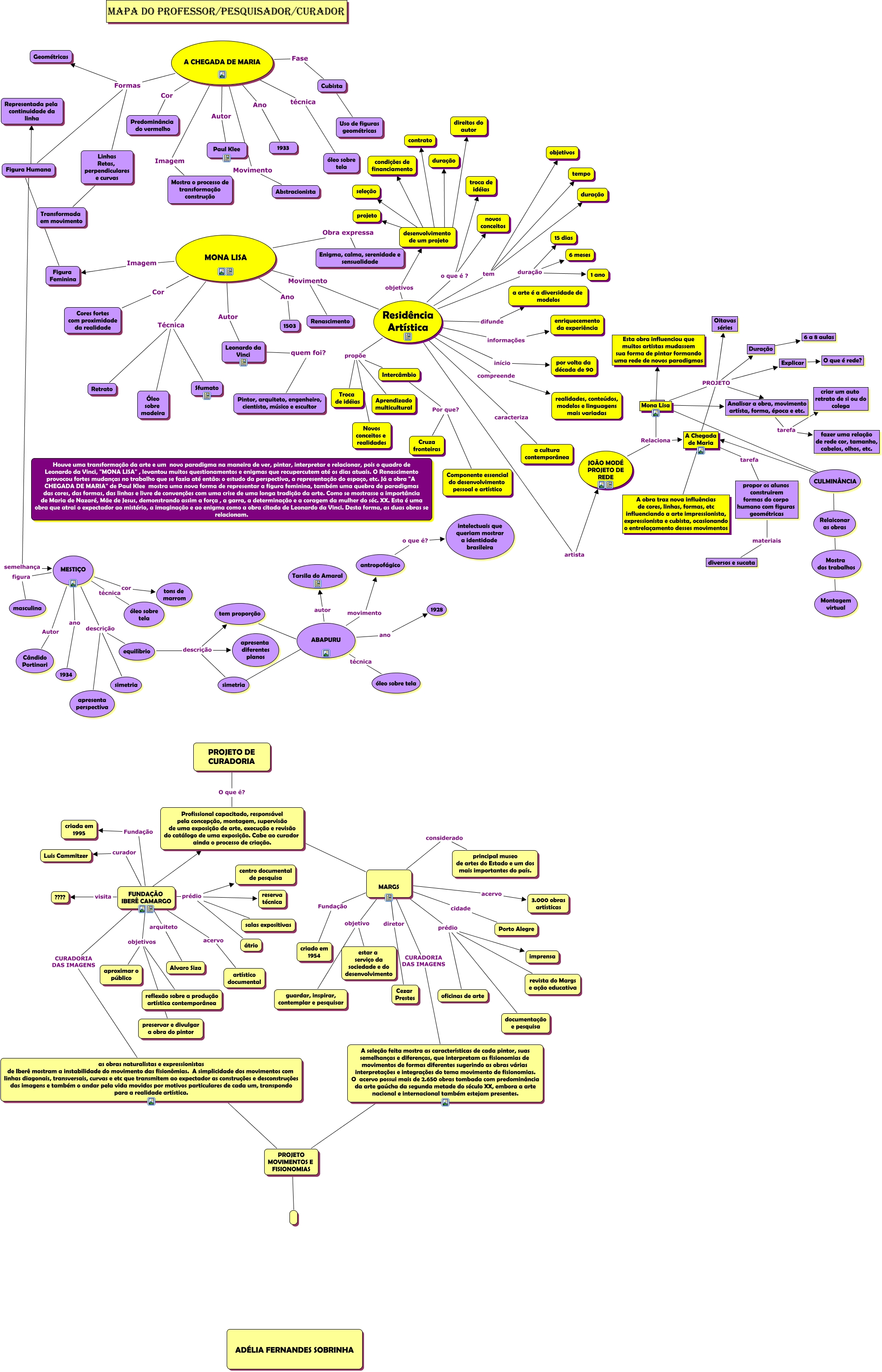 Esse mapa conceitual, produzido no IHMC CmapTools, tem a informação relacionada a: Mapa do professorPesquisadorCurador, FUNDAÇÃO IBERÊ CAMARGO CURADORIA DAS IMAGENS as obras naturalistas e expressionistas de Iberê mostram a instabilidade do movimento das fisionômias. A simplicidade dos movimentos com linhas diagonais, transversais, curvas e etc que transmitem ao expectador as construções e desconstruções das imagens e também o andar pela vida movidos por motivos particulares de cada um, transpondo para a realidade artística., Residência Artística informações enriquecemento da experiência, Mona Lisa PROJETO Duração, FUNDAÇÃO IBERÊ CAMARGO arquiteto Alvaro Siza, FUNDAÇÃO IBERÊ CAMARGO objetivos aproximar o público, Mona Lisa PROJETO Explicar, MONA LISA Ano 1503, MARGS objetivo guardar, inspirar, contemplar e pesquisar, JOÃO MODÉ PROJETO DE REDE Relaciona Mona Lisa, MONA LISA Técnica Óleo sobre madeira, Residência Artística propõe Aprendizado multicultural, Residência Artística início por volta da década de 90, A CHEGADA DE MARIA Imagem Mostra o processo de transformação construção, FUNDAÇÃO IBERÊ CAMARGO Fundação criada em 1995, JOÃO MODÉ PROJETO DE REDE Relaciona A Chegada de Maria, FUNDAÇÃO IBERÊ CAMARGO prédio reserva técnica, Residência Artística duração 15 dias, Residência Artística tem duração, equilíbrio descrição apresenta diferentes planos, A CHEGADA DE MARIA Ano 1933