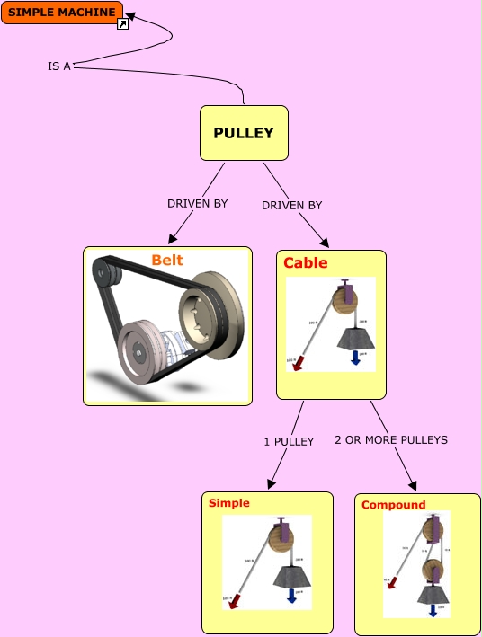 This Concept Map, created with IHMC CmapTools, has information related to: Pulleys, Cable 2 OR MORE PULLEYS Compound, PULLEY IS A SIMPLE MACHINE, Cable 1 PULLEY Simple, PULLEY DRIVEN BY Cable, PULLEY DRIVEN BY Belt
