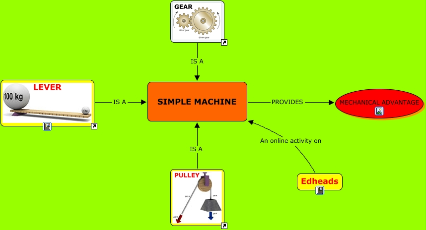 This Concept Map, created with IHMC CmapTools, has information related to: SimpleMachine, GEAR IS A SIMPLE MACHINE, Edheads An online activity on SIMPLE MACHINE, PULLEY IS A SIMPLE MACHINE, SIMPLE MACHINE PROVIDES MECHANICAL ADVANTAGE
