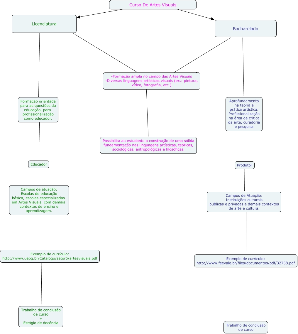 Esse mapa conceitual, produzido no IHMC CmapTools, tem a informação relacionada a: Curso de Artes Visuais, Exemplo de currículo: http://www.uepg.br/Catalogo/setor5/artesvisuais.pdf ???? Trabalho de conclusão de curso + Estágio de docência, Campos de Atuação: Instituições culturais públicas e privadas e demais contextos de arte e cultura. ???? Exemplo de currículo: http://www.feevale.br/files/documentos/pdf/32758.pdf, Bacharelado ???? -Formação ampla no campo das Artes Visuais -Diversas linguagens artísticas visuais (ex.: pintura, vídeo, fotografia, etc.), Curso De Artes Visuais ???? Bacharelado, Formação orientada para as questões da educação, para profissionalização como educador. ???? Educador, Aprofundamento na teoria e prática artística. Profissionalização na área de crítica da arte, curadoria e pesquisa ???? Produtor, Educador ???? Campos de atuação: Escolas de educação básica, escolas especializadas em Artes Visuais, com demais contextos de ensino e aprendizagem., Campos de atuação: Escolas de educação básica, escolas especializadas em Artes Visuais, com demais contextos de ensino e aprendizagem. ???? Exemplo de currículo: http://www.uepg.br/Catalogo/setor5/artesvisuais.pdf, Produtor ???? Campos de Atuação: Instituições culturais públicas e privadas e demais contextos de arte e cultura., Licenciatura ???? -Formação ampla no campo das Artes Visuais -Diversas linguagens artísticas visuais (ex.: pintura, vídeo, fotografia, etc.), Exemplo de currículo: http://www.feevale.br/files/documentos/pdf/32758.pdf ???? Trabalho de conclusão de curso, Curso De Artes Visuais ???? Licenciatura, Licenciatura ???? Formação orientada para as questões da educação, para profissionalização como educador., Bacharelado ???? Aprofundamento na teoria e prática artística. Profissionalização na área de crítica da arte, curadoria e pesquisa, -Formação ampla no campo das Artes Visuais -Diversas linguagens artísticas visuais (ex.: pintura, vídeo, fotografia, etc.) ???? Possibilita ao estudante a construção de uma sólida fundamentação nas linguagens artísticas, teóricas, sociológicas, antropológicas e filosóficas.