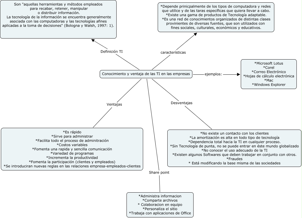 Este Cmap, tiene información relacionada con: Equipo07_trabajo del 26, Conocimiento y ventaja de las TI en las empresas ejemplos: *Microsoft Lotus *Corel *Correo Electrónico *Hojas de cálculo electrónica *Mac *Windows Explorer, Conocimiento y ventaja de las TI en las empresas Definición TI Son "aquellas herramientas y métodos empleados para recabar, retener, manipular o distribuir información. La tecnología de la información se encuentra generalmente asociada con las computadoras y las tecnologías afines aplicadas a la toma de decisiones" (Bologna y Walsh, 1997: 1)., Conocimiento y ventaja de las TI en las empresas Ventajas *Es rápido *Sirve para administrar *Facilita todo el proceso de adminitración *Costos variables *Fomenta una rapida y sencilla comunicación *Variedad de programas *Incrementa la productividad *Fomenta la participación (clientes y empleados) *Se introduciran nuevas reglas en las relaciones empresa-empleados-clientes, Conocimiento y ventaja de las TI en las empresas Share point *Administra informacion *Comparte archivos * Colaboracion en equipo *Personaliza el sitio *Trabaja con aplicaciones de Office, Conocimiento y ventaja de las TI en las empresas características *Depende prinicpalmente de los tipos de computadora y redes que utilice y de las taras específicas que quiera llevar a cabo. *Existe una gama de productos de Tecnología adaptable. *Es una red de conocimientos organizados de distintas clases provinientes de diversas fuentes, que son utilizados con fines sociales, culturales, económicos y educativos., Conocimiento y ventaja de las TI en las empresas Desventajas *No existe un contacto con los clientes *La amortización es alta en todo tipo de tecnología *Dependencia total hacia la TI en cualquier proceso. *Sin Tecnología de punta, no se puede entrar en éste mundo globalizado *No conocer el uso adecuado de la TI *Existen algunos Softwares que deben trabajar en conjunto con otros. *Fraudes * Está modificando la base misma de las sociedades