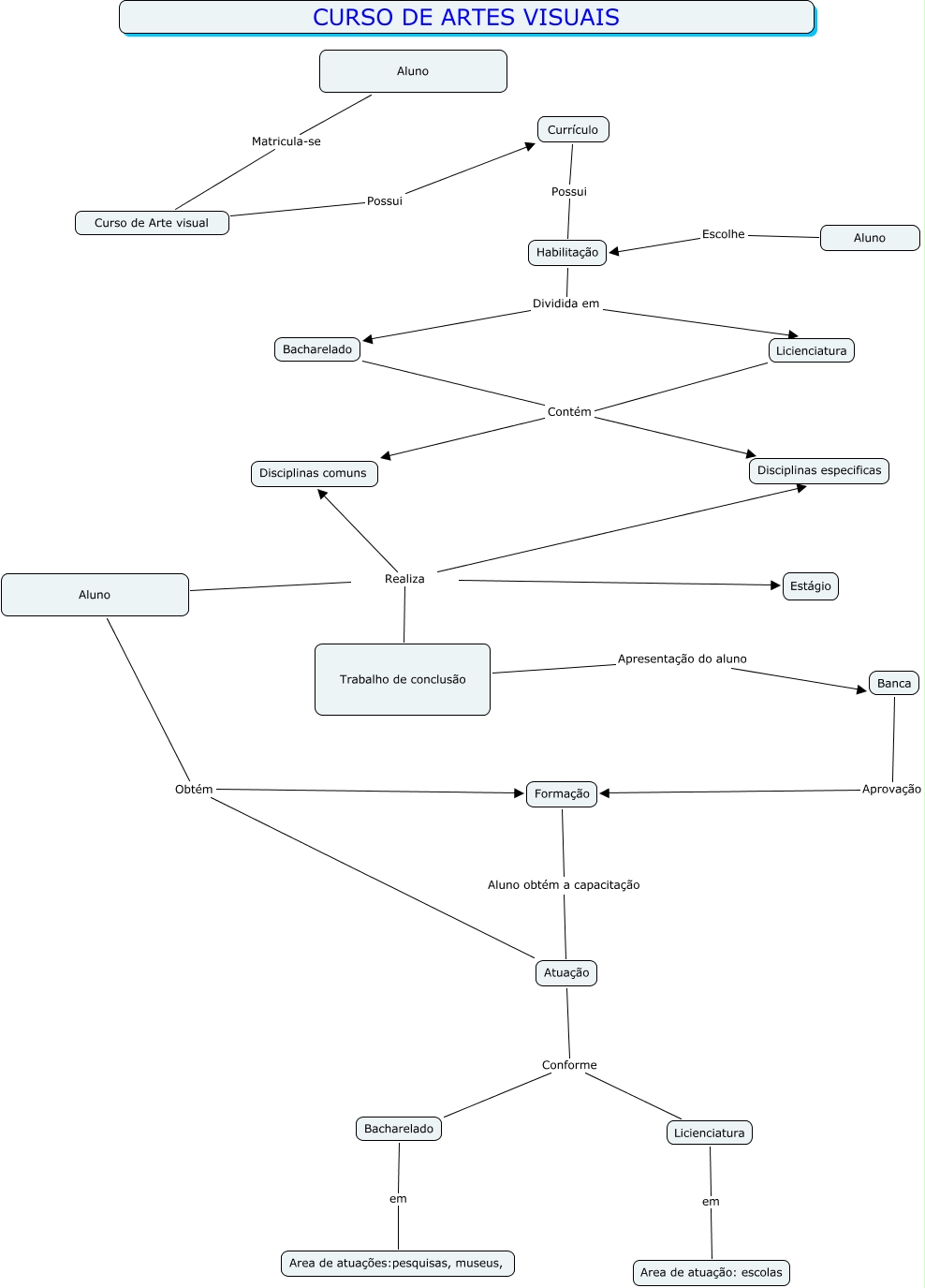 Esse mapa conceitual, produzido no IHMC CmapTools, tem a informação relacionada a: Mapa1, Licienciatura Contém Disciplinas comuns, Atuação Conforme Licienciatura, Formação Aluno obtém a capacitação Atuação, Bacharelado em Area de atuações:pesquisas, museus,, Aluno Realiza Trabalho de conclusão, Aluno Realiza Estágio, Aluno Realiza Disciplinas comuns, Bacharelado Contém Disciplinas especificas, Curso de Arte visual Possui Currículo, Licienciatura em Area de atuação: escolas, Atuação Conforme Bacharelado, Aluno Escolhe Habilitação, Trabalho de conclusão Apresentação do aluno Banca, Aluno Obtém Formação, Banca Aprovação Formação, Aluno Matricula-se Curso de Arte visual, Habilitação Dividida em Licienciatura, Bacharelado Contém Disciplinas comuns, Atuação Obtém Formação, Currículo Possui Habilitação