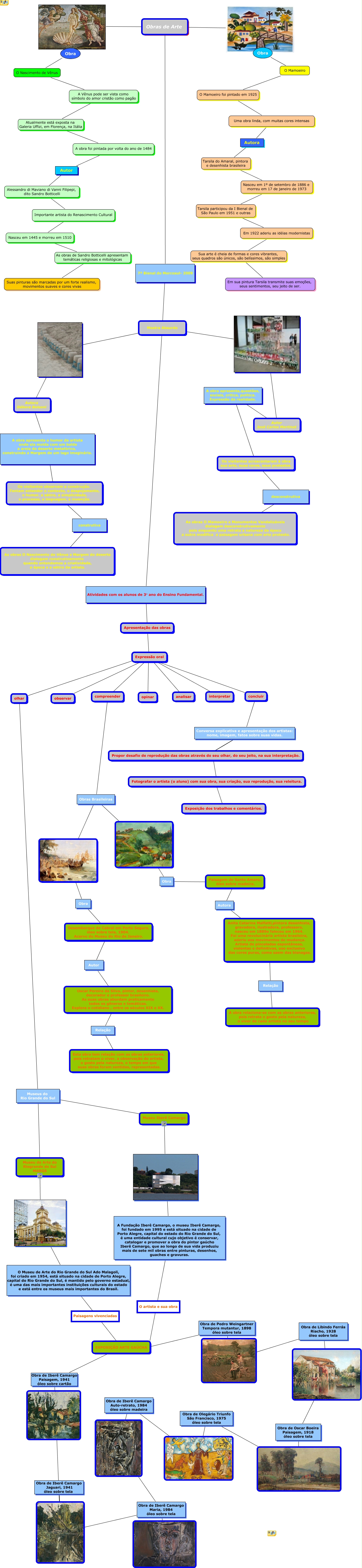 Esse mapa conceitual, produzido no IHMC CmapTools, tem a informação relacionada a: 7ª Bienal do Mercosul - Ivone Segaspini, O Museu de Arte do Rio Grande do Sul Ado Malagoli, foi criado em 1954, está situado na cidade de Porto Alegre, capital do Rio Grande do Sul, é mantido pelo governo estadual, é uma das mais importantes instituições culturais do estado e está entre os museus mais importantes do Brasil. EXPOSIÇÃO ARTE GAÚCHA, Obras de Arte 7ª Bienal do Mercosul- 2009 Mostra Absurdo, Nasceu em 1445 e morreu em 1510 As obras de Sandro Botticelli apresentam temáticas religiosas e mitológicas Suas pinturas são marcadas por um forte realismo, movimentos suaves e cores vivas, Mostra Absurdo Autora Débora Bolsoni, Expressão oral ???? olhar, Apresentação das obras ???? Expressão oral, A Vênus pode ser vista como símbolo do amor cristão como pagão Atualmente está exposta na Galeria Uffizi, em Florença, na Itália A obra foi pintada por volta do ano de 1484, Obra Desembarque de Cabral em Porto Seguro, óleo sobre tela, 1904. Acervo do Museu do Rio de Janeiro., Obras de Arte Obra, Expressão oral ???? compreender, Propor desafio de reprodução das obras através do seu olhar, do seu jeito, na sua interpretação. ???? Fotografar o artista (o aluno) com sua obra, sua criação, sua reprodução, sua releitura., Obra O Mamoeiro O Mamoeiro foi pintado em 1925, Obra de Pedro Weingartner Tempora mutantur, 1898 óleo sobre tela EXPOSIÇÃO ARTE GAÚCHA, Em 1922 aderiu as idéias modernistas Sua arte é cheia de formas e cores vibrantes, seus quadros são únicos, são belíssimos, são simples Em sua pintura Tarsila transmite suas emoções, seus sentimentos, seu jeito de ser., Desembarque de Cabral em Porto Seguro, óleo sobre tela, 1904. Acervo do Museu do Rio de Janeiro. Autor Oscar Pereira da Silva, pintor, desenhista, decorador e professor brasileiro. As suas obras abordam praticamente todos os gêneros e temáticas. Explora o cotidiano , entre os séculos XIX e XX., Obra de Oscar Boeira Paisagem, 1918 óleo sobre tela, Obras de Arte Obra, concluir Conversa explicativa e apresentação dos artistas: nome, imagem, fatos sobre suas vidas. Propor desafio de reprodução das obras através do seu olhar, do seu jeito, na sua interpretação., Autor José Carlos Martinat A obra apresenta,questões, sociais, crítica, política. Expressão da realidade. Os visitantes acrescentaram à obra sua arte, suas cores, seus protestos., Obra de Iberê Camargo Jaguari, 1941 óleo sobre tela