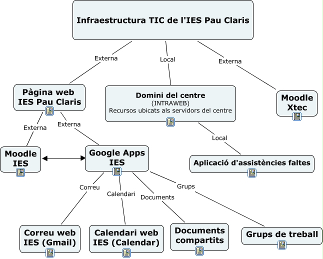 Este Cmap, tiene información relacionada con: Domini, Infraestructura TIC de l'IES Pau Claris Local Domini del centre (INTRAWEB) Recursos ubicats als servidors del centre, Pàgina web IES Pau Claris Externa Moodle IES, Infraestructura TIC de l'IES Pau Claris Externa Moodle Xtec, Google Apps IES Correu Correu web IES (Gmail), Google Apps IES ???? Moodle IES, Google Apps IES Grups Grups de treball, Pàgina web IES Pau Claris Externa Google Apps IES, Infraestructura TIC de l'IES Pau Claris Externa Pàgina web IES Pau Claris, Google Apps IES Documents Documents compartits, Domini del centre (INTRAWEB) Recursos ubicats als servidors del centre Local Aplicació d'assistències faltes, Google Apps IES Calendari Calendari web IES (Calendar)
