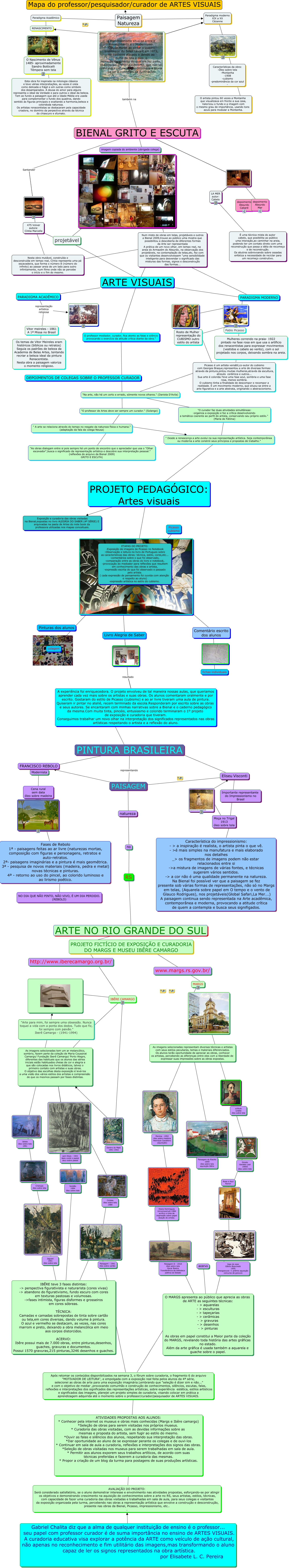 Esse mapa conceitual, produzido no IHMC CmapTools, tem a informação relacionada a: Professor pesquisador curador de Artes Visuais pronto para avaliação, projetável ???? ARTE VISUAIS, PARADIGMA ACADÊMICO representação artística religiosa, Paradigma Acadêmico ???? Esta obra foi inspirada na mitologia clássica e teve várias interpretações, as vezes é vista como delicada e frágil e em outras como símbolo dos desamparados. A deusa do amor para alguns representa o ideal da Verdade e para outros o ideal da beleza. Tem ao fundo a paisagem que até a Idade Média era usada para complementar o fundo dos quadros, dando sentido às figuras principais e exaltando a harmonia,beleza e coloridoda natureza. Os artistas renacentistas se destacaram pela capacidade criadora, no domínio da perpectiva através da técnica do chiascuro e sfumato., Menina - 1952 óleo sobre madeira Henrique Cavalleiro (aquisição) ???? ????, , ???? ,, Nesta obra mutável, construída e desconstruída em tempo real, Cíntia representa uma pá escavadeira, que forma o número 8 (número do infinito) ao passar areia de um lado para outro infinitamente, num filme onde não se percebe o início e o fim do mesmo. ???? ????, " A arte se relaciona através do tempo no resgate da natureza física e humana." (adaptação da fala da colega Neusa) ???? " Desde a renascença a arte evolui na sua representação artística. Seja contemporânea ou moderna a arte constrói seus príncipios e propostas de trabalho.", , ???? ,, depoimento Absurdo Mar ???? ,, PARADIGMA ACADÊMICO representação artística religiosa Os temas de Vitor Meireles eram históricos (bíblicos ou retratos) Seguia os padrões de beleza da Academia de Belas Artes, tentando recriar a beleza ideal da pintura Renacentista. Nesta obra a paisagem valoriza o momento religioso., Diana Domingues Universusmuti-1984 acrílico e tinta de impressão sobre papel doação do artista. ???? ,, Paisagem Natureza no Paradigma moderno XIX a XX Cézanne, Eliseu Visconti ???? Característica do impressionismo: - > a inspiração é realista, o artista pinta o que vê. - >é mais simples na manufatura e mais elaborado nos detalhes _> os fragmentos de imagens podem não estar relacionados entre si ->a mistura de imagens de várias fontes, e técnicas sugerem vários sentidos. -> a cor não é uma qualidade permanente na natureza. Na Bienal foi possível ver que a paisagem se fez presente sob várias formas de representações, não só no Margs em telas, (Aquarela sobre papel em O tempo e o vento de Glauco Rodrigues), nos projetáveis(Global Safari,La Mer...) A paisagem continua sendo representada na Arte acadêmica, contemporânea e moderna, provocando a atitude crítica de quem a contempla e busca seus signifigados., Paisagem Natureza também na Num misto de obras em telas, projetáveis e outros a Bienal 2009,trouxe ao público uma mostra que possibilitou a descoberta de diferentes formas da Arte ser representada A prática de um novo olhar, em tempo real, na areia do Armazém do Absurdo, na observação dos projetáveis, na contemplação de telas,etc, fez com que os visitantes desenvolvessem "uma sensibilidade inteligente para desvendar o significado das misturas das formas, signos e desconstrução das formas..., ???? ???? Pablo Picasso, O impressionismo situa-se entre o Renascimento e o Modernismo. Claude Monet ao pintar o quadro Impression du Solell Levant em 1873, foi bastante atacado e devido ao nome da tela à óleo, o nome do movimento do qual ele fez parte, chamou-se: IMPRESSIONISMO, que não só retratava a natureza mas dominava a teoria da cor e condições da iluminação. ???? RENASCIMENTO, IBÊRE CAMARGO ???? ,, RS ???? ARTE NO RIO GRANDE DO SUL, "Na arte, não há um certo e errado, sómente novos olhares." (Daniela D'Avila) ???? "O curador faz duas atividades simultâneas: -organiza a exposição e faz a crítica desenvolvendo a temática coerente ao perfil do artista, conservando seu próprio estilo." (Maria de Fátima), NO DIA QUE NÃO PINTO, NÃO VIVO, É UM DIA PERDIDO. (REBOLO) ???? Fases de Rebolo 1ª - paisagens feitas ao ar livre (naturezas mortas, composição com figuras e personagens, retratos e auto-retratos. 2ª- paisagens imaginárias e a pintura é mais geométrica. 3ª - pesquisa de novos materiais (madeira, pedra e metal) novas técnicas e pinturas. 4ª - retorno ao uso do pincel, ao colorido luminoso e ao lirismo poético.