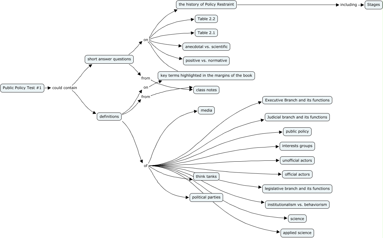 This Concept Map, created with IHMC CmapTools, has information related to: public policy test1, Public Policy Test #1 could contain definitions, definitions of applied science, short answer questions on anecdotal vs. scientific, short answer questions from class notes, Public Policy Test #1 could contain short answer questions, short answer questions on Table 2.2, definitions of public policy, definitions from class notes, short answer questions on Table 2.1, short answer questions on the history of Policy Restraint, definitions of political parties, definitions of institutionalism vs. behaviorism, definitions of interests groups, definitions of legislative branch and its functions, definitions on key terms highlighted in the margins of the book, definitions of official actors, definitions of Judicial branch and its functions, definitions of media, definitions of Executive Branch and its functions, short answer questions on positive vs. normative