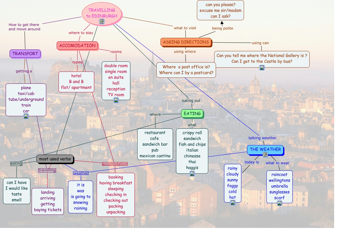 Este Cmap, tiene información relacionada con: travelling to Edinburgh, ACCOMODATION types hotel B and B flat/ apartment, TRANSPORT travelling landing arriving getting baying tickets, TRAVELLING to EDINBURGH How to get there and move around TRANSPORT, ASKING DIRECTIONS being polite can you please? excuse me sir/madam can I ask?, TRAVELLING to EDINBURGH where to stay ACCOMODATION, most used verbs travelling landing arriving getting baying tickets, THE WEATHER what to wear raincoat wellingtons umbrella sunglasses scarf, ASKING DIRECTIONS using where Where a post office is? Where can I by a postcard?, EATING eating can I have I would like taste smell, THE WEATHER weather it is was is going to snowing raining, most used verbs eating can I have I would like taste smell, TRAVELLING to EDINBURGH eating out EATING, THE WEATHER today is rainy cloudy sunny foggy cold hot, TRAVELLING to EDINBURGH ???? most used verbs, EATING where restaurant cafe sandwich bar pub mexican cantina, ACCOMODATION accomodation booking having breakfast sleeping checking in checking out packing unpacking, TRAVELLING to EDINBURGH talking weather THE WEATHER, most used verbs accomodation booking having breakfast sleeping checking in checking out packing unpacking, most used verbs weather it is was is going to snowing raining, TRAVELLING to EDINBURGH what to visit ASKING DIRECTIONS