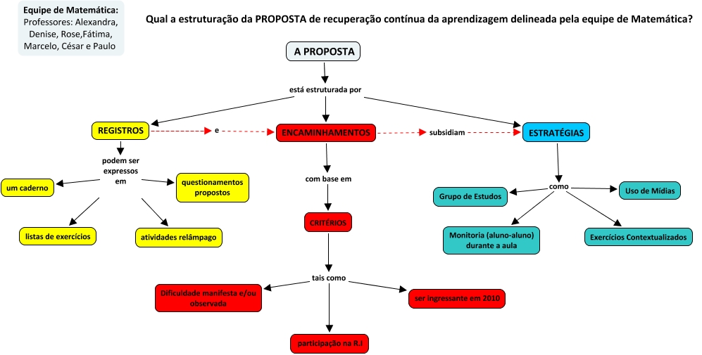 Esse mapa conceitual, produzido no IHMC CmapTools, tem a informação relacionada a: A proposta de Matemática_2010, CRITÉRIOS tais como Dificuldade manifesta e/ou observada, ENCAMINHAMENTOS com base em CRITÉRIOS, CRITÉRIOS tais como participação na R.I, A PROPOSTA está estruturada por REGISTROS, ESTRATÉGIAS como Uso de Mídias, ESTRATÉGIAS como Grupo de Estudos, A PROPOSTA está estruturada por ESTRATÉGIAS, REGISTROS e ENCAMINHAMENTOS, CRITÉRIOS tais como ser ingressante em 2010, A PROPOSTA está estruturada por ENCAMINHAMENTOS, REGISTROS podem ser expressos em listas de exercícios, REGISTROS podem ser expressos em um caderno, REGISTROS podem ser expressos em atividades relâmpago, ENCAMINHAMENTOS subsidiam ESTRATÉGIAS, ESTRATÉGIAS como Monitoria (aluno-aluno) durante a aula, ESTRATÉGIAS como Exercícios Contextualizados, REGISTROS podem ser expressos em questionamentos propostos