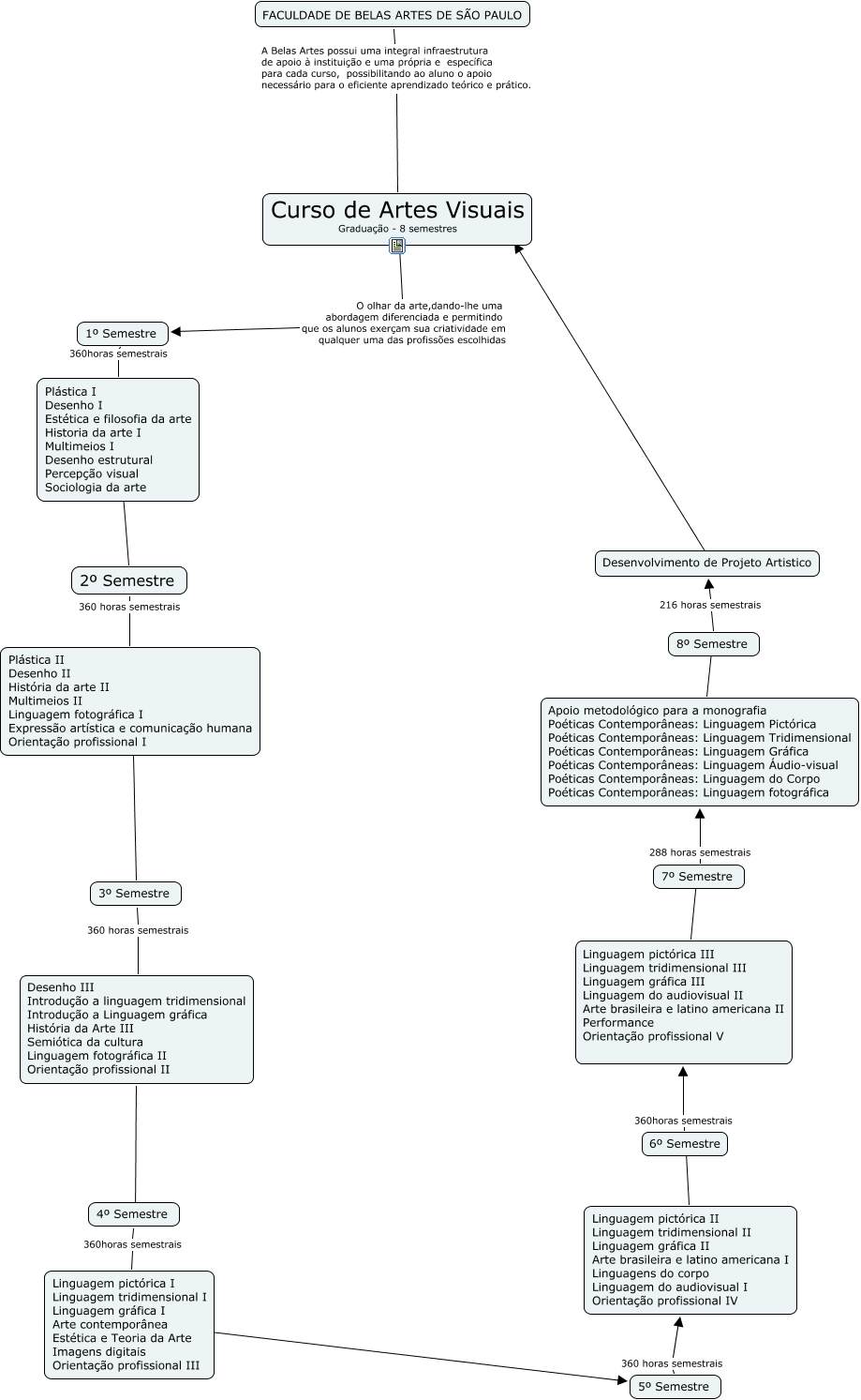 Esse mapa conceitual, produzido no IHMC CmapTools, tem a informação relacionada a: MAPA CURRICULO CURSO ARTES, 5º Semestre 360 horas semestrais Linguagem pictórica II Linguagem tridimensional II Linguagem gráfica II Arte brasileira e latino americana I Linguagens do corpo Linguagem do audiovisual I Orientação profissional IV, Desenho III Introdução a linguagem tridimensional Introdução a Linguagem gráfica História da Arte III Semiótica da cultura Linguagem fotográfica II Orientação profissional II ???? 4º Semestre, Linguagem pictórica II Linguagem tridimensional II Linguagem gráfica II Arte brasileira e latino americana I Linguagens do corpo Linguagem do audiovisual I Orientação profissional IV ???? 6º Semestre, Apoio metodológico para a monografia Poéticas Contemporâneas: Linguagem Pictórica Poéticas Contemporâneas: Linguagem Tridimensional Poéticas Contemporâneas: Linguagem Gráfica Poéticas Contemporâneas: Linguagem Áudio-visual Poéticas Contemporâneas: Linguagem do Corpo Poéticas Contemporâneas: Linguagem fotográfica ???? 8º Semestre, 1º Semestre 360horas semestrais Plástica I Desenho I Estética e filosofia da arte Historia da arte I Multimeios I Desenho estrutural Percepção visual Sociologia da arte, 2º Semestre 360 horas semestrais Plástica II Desenho II História da arte II Multimeios II Linguagem fotográfica I Expressão artística e comunicação humana Orientação profissional I, 7º Semestre 288 horas semestrais Apoio metodológico para a monografia Poéticas Contemporâneas: Linguagem Pictórica Poéticas Contemporâneas: Linguagem Tridimensional Poéticas Contemporâneas: Linguagem Gráfica Poéticas Contemporâneas: Linguagem Áudio-visual Poéticas Contemporâneas: Linguagem do Corpo Poéticas Contemporâneas: Linguagem fotográfica, FACULDADE DE BELAS ARTES DE SÃO PAULO A Belas Artes possui uma integral infraestrutura de apoio à instituição e uma própria e específica para cada curso, possibilitando ao aluno o apoio necessário para o eficiente aprendizado teórico e prático. Curso de Artes Visuais Graduação - 8 semestres, Curso de Artes Visuais Graduação - 8 semestres O olhar da arte,dando-lhe uma abordagem diferenciada e permitindo que os alunos exerçam sua criatividade em qualquer uma das profissões escolhidas 1º Semestre, Linguagem pictórica III Linguagem tridimensional III Linguagem gráfica III Linguagem do audiovisual II Arte brasileira e latino americana II Performance Orientação profissional V ???? 7º Semestre, Linguagem pictórica I Linguagem tridimensional I Linguagem gráfica I Arte contemporânea Estética e Teoria da Arte Imagens digitais Orientação profissional III ???? 5º Semestre, 6º Semestre 360horas semestrais Linguagem pictórica III Linguagem tridimensional III Linguagem gráfica III Linguagem do audiovisual II Arte brasileira e latino americana II Performance Orientação profissional V, Plástica I Desenho I Estética e filosofia da arte Historia da arte I Multimeios I Desenho estrutural Percepção visual Sociologia da arte ???? 2º Semestre, 3º Semestre 360 horas semestrais Desenho III Introdução a linguagem tridimensional Introdução a Linguagem gráfica História da Arte III Semiótica da cultura Linguagem fotográfica II Orientação profissional II, Plástica II Desenho II História da arte II Multimeios II Linguagem fotográfica I Expressão artística e comunicação humana Orientação profissional I ???? 3º Semestre, 4º Semestre 360horas semestrais Linguagem pictórica I Linguagem tridimensional I Linguagem gráfica I Arte contemporânea Estética e Teoria da Arte Imagens digitais Orientação profissional III, Desenvolvimento de Projeto Artistico ???? ????, 8º Semestre 216 horas semestrais Desenvolvimento de Projeto Artistico