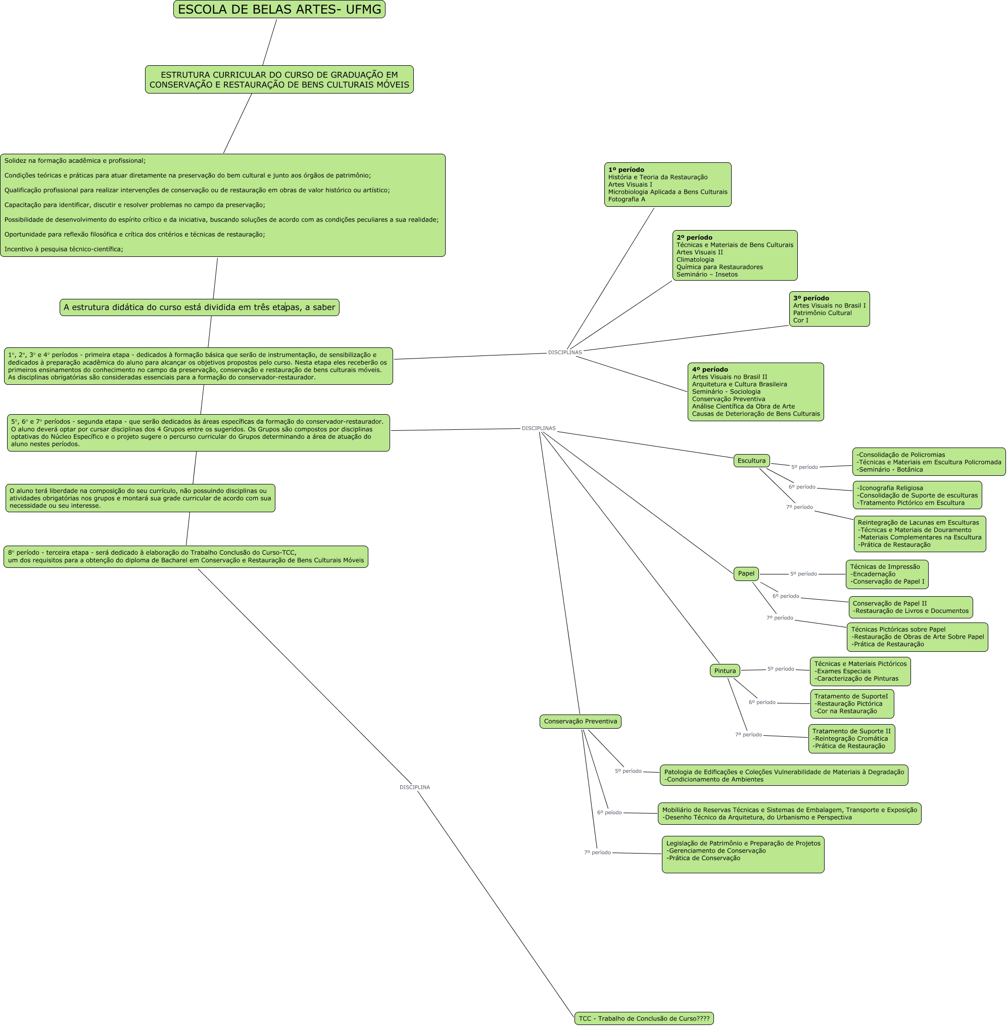 Esse mapa conceitual, produzido no IHMC CmapTools, tem a informação relacionada a: MAPA CURRÍCULO DE ARTES, Conservação Preventiva 7º período Legislação de Patrimônio e Preparação de Projetos -Gerenciamento de Conservação -Prática de Conservação, Papel 6º período Conservação de Papel II -Restauração de Livros e Documentos, 1°, 2°, 3° e 4° períodos - primeira etapa - dedicados à formação básica que serão de instrumentação, de sensibilização e dedicados à preparação acadêmica do aluno para alcançar os objetivos propostos pelo curso. Nesta etapa eles receberão os primeiros ensinamentos do conhecimento no campo da preservação, conservação e restauração de bens culturais móveis. As disciplinas obrigatórias são consideradas essenciais para a formação do conservador-restaurador. DISCIPLINAS 2º período Técnicas e Materiais de Bens Culturais Artes Visuais II Climatologia Química para Restauradores Seminário – Insetos, Solidez na formação acadêmica e profissional; Condições teóricas e práticas para atuar diretamente na preservação do bem cultural e junto aos órgãos de patrimônio; Qualificação profissional para realizar intervenções de conservação ou de restauração em obras de valor histórico ou artístico; Capacitação para identificar, discutir e resolver problemas no campo da preservação; Possibilidade de desenvolvimento do espírito crítico e da iniciativa, buscando soluções de acordo com as condições peculiares a sua realidade; Oportunidade para reflexão filosófica e crítica dos critérios e técnicas de restauração; Incentivo à pesquisa técnico-científica; ???? 8° período - terceira etapa - será dedicado à elaboração do Trabalho Conclusão do Curso-TCC, um dos requisitos para a obtenção do diploma de Bacharel em Conservação e Restauração de Bens Culturais Móveis, ESCOLA DE BELAS ARTES- UFMG ???? Solidez na formação acadêmica e profissional; Condições teóricas e práticas para atuar diretamente na preservação do bem cultural e junto aos órgãos de patrimônio; Qualificação profissional para realizar intervenções de conservação ou de restauração em obras de valor histórico ou artístico; Capacitação para identificar, discutir e resolver problemas no campo da preservação; Possibilidade de desenvolvimento do espírito crítico e da iniciativa, buscando soluções de acordo com as condições peculiares a sua realidade; Oportunidade para reflexão filosófica e crítica dos critérios e técnicas de restauração; Incentivo à pesquisa técnico-científica;, Papel 5º período Técnicas de Impressão -Encadernação -Conservação de Papel I, Papel 7º período Técnicas Pictóricas sobre Papel -Restauração de Obras de Arte Sobre Papel -Prática de Restauração, 8° período - terceira etapa - será dedicado à elaboração do Trabalho Conclusão do Curso-TCC, um dos requisitos para a obtenção do diploma de Bacharel em Conservação e Restauração de Bens Culturais Móveis DISCIPLINA TCC - Trabalho de Conclusão de Curso????, Escultura 6º período -Iconografia Religiosa -Consolidação de Suporte de esculturas -Tratamento Pictórico em Escultura, 5°, 6° e 7° períodos - segunda etapa - que serão dedicados às áreas específicas da formação do conservador-restaurador. O aluno deverá optar por cursar disciplinas dos 4 Grupos entre os sugeridos. Os Grupos são compostos por disciplinas optativas do Núcleo Específico e o projeto sugere o percurso curricular do Grupos determinando a área de atuação do aluno nestes períodos. DISCIPLINAS Papel, Escultura 7º período Reintegração de Lacunas em Esculturas -Técnicas e Materiais de Douramento -Materiais Complementares na Escultura -Prática de Restauração, Conservação Preventiva 5º período Patologia de Edificações e Coleções Vulnerabilidade de Materiais à Degradação -Condicionamento de Ambientes, Escultura 5º período -Consolidação de Policromias -Técnicas e Materiais em Escultura Policromada -Seminário - Botânica, 5°, 6° e 7° períodos - segunda etapa - que serão dedicados às áreas específicas da formação do conservador-restaurador. O aluno deverá optar por cursar disciplinas dos 4 Grupos entre os sugeridos. Os Grupos são compostos por disciplinas optativas do Núcleo Específico e o projeto sugere o percurso curricular do Grupos determinando a área de atuação do aluno nestes períodos. DISCIPLINAS Escultura, 1°, 2°, 3° e 4° períodos - primeira etapa - dedicados à formação básica que serão de instrumentação, de sensibilização e dedicados à preparação acadêmica do aluno para alcançar os objetivos propostos pelo curso. Nesta etapa eles receberão os primeiros ensinamentos do conhecimento no campo da preservação, conservação e restauração de bens culturais móveis. As disciplinas obrigatórias são consideradas essenciais para a formação do conservador-restaurador. DISCIPLINAS 4º período Artes Visuais no Brasil II Arquitetura e Cultura Brasileira Seminário - Sociologia Conservação Preventiva Análise Científica da Obra de Arte Causas de Deterioração de Bens Culturais, Conservação Preventiva 6º peíodo Mobiliário de Reservas Técnicas e Sistemas de Embalagem, Transporte e Exposição -Desenho Técnico da Arquitetura, do Urbanismo e Perspectiva, 5°, 6° e 7° períodos - segunda etapa - que serão dedicados às áreas específicas da formação do conservador-restaurador. O aluno deverá optar por cursar disciplinas dos 4 Grupos entre os sugeridos. Os Grupos são compostos por disciplinas optativas do Núcleo Específico e o projeto sugere o percurso curricular do Grupos determinando a área de atuação do aluno nestes períodos. DISCIPLINAS Pintura, 1°, 2°, 3° e 4° períodos - primeira etapa - dedicados à formação básica que serão de instrumentação, de sensibilização e dedicados à preparação acadêmica do aluno para a