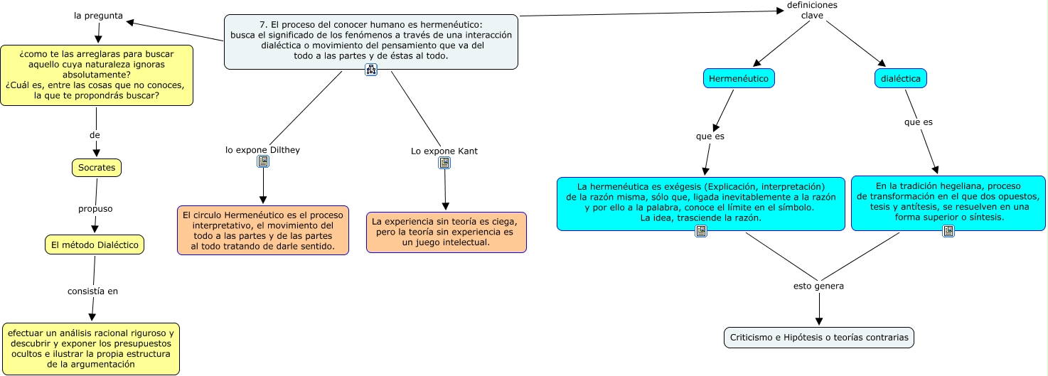 Este Cmap, tiene información relacionada con: 7. El proceso del conocer humano es Hermeneutico, Socrates propuso El método Dialéctico, 7. El proceso del conocer humano es hermenéutico: busca el significado de los fenómenos a través de una interacción dialéctica o movimiento del pensamiento que va del todo a las partes y de éstas al todo. definiciones clave dialéctica, En la tradición hegeliana, proceso de transformación en el que dos opuestos, tesis y antítesis, se resuelven en una forma superior o síntesis. esto genera Criticismo e Hipótesis o teorías contrarias, El método Dialéctico consistía en efectuar un análisis racional riguroso y descubrir y exponer los presupuestos ocultos e ilustrar la propia estructura de la argumentación, Hermenéutico que es La hermenéutica es exégesis (Explicación, interpretación) de la razón misma, sólo que, ligada inevitablemente a la razón y por ello a la palabra, conoce el límite en el símbolo. La idea, trasciende la razón., dialéctica que es En la tradición hegeliana, proceso de transformación en el que dos opuestos, tesis y antítesis, se resuelven en una forma superior o síntesis., 7. El proceso del conocer humano es hermenéutico: busca el significado de los fenómenos a través de una interacción dialéctica o movimiento del pensamiento que va del todo a las partes y de éstas al todo. Lo expone Kant La experiencia sin teoría es ciega, pero la teoría sin experiencia es un juego intelectual., 7. El proceso del conocer humano es hermenéutico: busca el significado de los fenómenos a través de una interacción dialéctica o movimiento del pensamiento que va del todo a las partes y de éstas al todo. la pregunta ¿como te las arreglaras para buscar aquello cuya naturaleza ignoras absolutamente? ¿Cuál es, entre las cosas que no conoces, la que te propondrás buscar?, 7. El proceso del conocer humano es hermenéutico: busca el significado de los fenómenos a través de una interacción dialéctica o movimiento del pensamiento que va del todo a las partes y de éstas al todo. definiciones clave Hermenéutico, ¿como te las arreglaras para buscar aquello cuya naturaleza ignoras absolutamente? ¿Cuál es, entre las cosas que no conoces, la que te propondrás buscar? de Socrates, 7. El proceso del conocer humano es hermenéutico: busca el significado de los fenómenos a través de una interacción dialéctica o movimiento del pensamiento que va del todo a las partes y de éstas al todo. lo expone Dilthey El circulo Hermenéutico es el proceso interpretativo, el movimiento del todo a las partes y de las partes al todo tratando de darle sentido., La hermenéutica es exégesis (Explicación, interpretación) de la razón misma, sólo que, ligada inevitablemente a la razón y por ello a la palabra, conoce el límite en el símbolo. La idea, trasciende la razón. esto genera Criticismo e Hipótesis o teorías contrarias