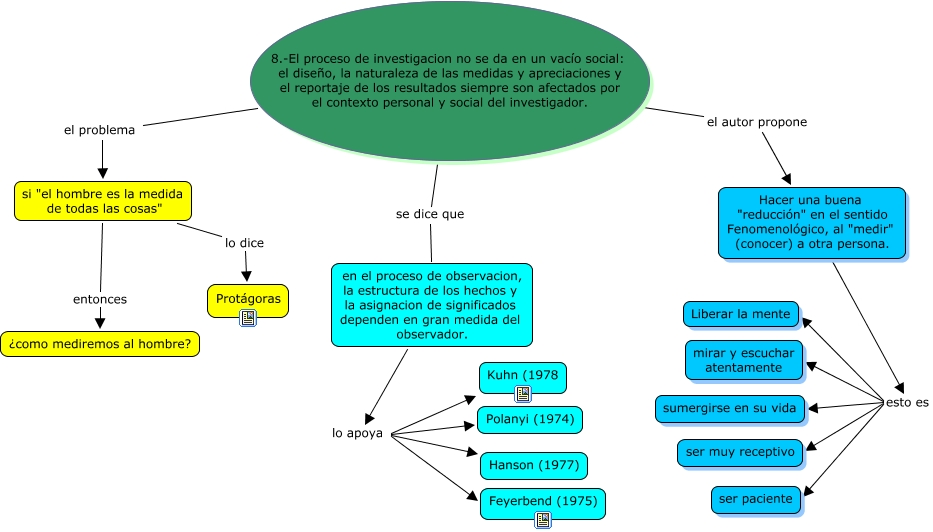 Este Cmap, tiene información relacionada con: El proceso de investigacion no se da en un vacio social, en el proceso de observacion, la estructura de los hechos y la asignacion de significados dependen en gran medida del observador. lo apoya Hanson (1977), en el proceso de observacion, la estructura de los hechos y la asignacion de significados dependen en gran medida del observador. lo apoya Feyerbend (1975), si "el hombre es la medida de todas las cosas" lo dice Protágoras, 8.-El proceso de investigacion no se da en un vacío social: el diseño, la naturaleza de las medidas y apreciaciones y el reportaje de los resultados siempre son afectados por el contexto personal y social del investigador. el problema si "el hombre es la medida de todas las cosas", Hacer una buena "reducción" en el sentido Fenomenológico, al "medir" (conocer) a otra persona. esto es mirar y escuchar atentamente, en el proceso de observacion, la estructura de los hechos y la asignacion de significados dependen en gran medida del observador. lo apoya Polanyi (1974), Hacer una buena "reducción" en el sentido Fenomenológico, al "medir" (conocer) a otra persona. esto es sumergirse en su vida, Hacer una buena "reducción" en el sentido Fenomenológico, al "medir" (conocer) a otra persona. esto es ser paciente, Hacer una buena "reducción" en el sentido Fenomenológico, al "medir" (conocer) a otra persona. esto es Liberar la mente, si "el hombre es la medida de todas las cosas" entonces ¿como mediremos al hombre?, 8.-El proceso de investigacion no se da en un vacío social: el diseño, la naturaleza de las medidas y apreciaciones y el reportaje de los resultados siempre son afectados por el contexto personal y social del investigador. se dice que en el proceso de observacion, la estructura de los hechos y la asignacion de significados dependen en gran medida del observador., en el proceso de observacion, la estructura de los hechos y la asignacion de significados dependen en gran medida del observador. lo apoya Kuhn (1978, Hacer una buena "reducción" en el sentido Fenomenológico, al "medir" (conocer) a otra persona. esto es ser muy receptivo, 8.-El proceso de investigacion no se da en un vacío social: el diseño, la naturaleza de las medidas y apreciaciones y el reportaje de los resultados siempre son afectados por el contexto personal y social del investigador. el autor propone Hacer una buena "reducción" en el sentido Fenomenológico, al "medir" (conocer) a otra persona.