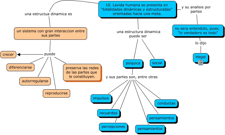 Este Cmap, tiene información relacionada con: 10. la vida humana se presenta en totalidades dinámicas y estructuradas orientadas hacia una meta, no sera entendido, pues; "lo verdadero es todo" lo dijo Hegel, psiquica y sus partes son, entre otras pensamientos, psiquica y sus partes son, entre otras recuerdos, 10. Lavida humana se presenta en "totalidades dinámicas y estructuradas" orientadas hacia una meta. una estructua dinamica es un sistema con gran interaccion entre sus partes, un sistema con gran interaccion entre sus partes puede preserva las redes de las partes que le constituyen., un sistema con gran interaccion entre sus partes puede crecer, 10. Lavida humana se presenta en "totalidades dinámicas y estructuradas" orientadas hacia una meta. una estructura dinamica puede ser psiquica, 10. Lavida humana se presenta en "totalidades dinámicas y estructuradas" orientadas hacia una meta. una estructura dinamica puede ser social, psiquica y sus partes son, entre otras percepciones, psiquica y sus partes son, entre otras impulsos, psiquica y sus partes son, entre otras conductas, un sistema con gran interaccion entre sus partes puede diferenciarse, psiquica y sus partes son, entre otras pensamientos, 10. Lavida humana se presenta en "totalidades dinámicas y estructuradas" orientadas hacia una meta. y su analisis por partes no sera entendido, pues; "lo verdadero es todo", un sistema con gran interaccion entre sus partes puede autorregularse, un sistema con gran interaccion entre sus partes puede reproducirse