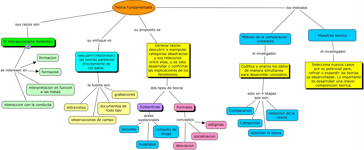 Este Cmap, tiene información relacionada con: Teoria Fundamentada, Codifica y analiza los datos de manera simultanea para desarrollar conceptos. esto en 4 etapas que son: Comparacion, El interaccionismo Simbolico se interesan en formacion, El interaccionismo Simbolico se interesan en interaccion con la conducta, El interaccionismo Simbolico se interesan en interpretacion en funcion a las metas, Generar teoria: descubrir o manipular categorias abastractas y sus relaciones entre ellas, y de esto desarrollar o confirmar las explicaciones de los fenomenos. dos tipos de teoria Sustantivas, descubrir(interpretar) las teorias partiendo directamente de los datos. la fuente son observaciones de campo, Teoria Fundamentada su enfoque es descubrir(interpretar) las teorias partiendo directamente de los datos., Sustantivas areas sustanciales hospitales, Formales conceptos estigmas, descubrir(interpretar) las teorias partiendo directamente de los datos. la fuente son grabaciones, Teoria Fundamentada los metodos Muestreo teorico, Teoria Fundamentada los metodos Metodo de la comparacion constante, Codifica y analiza los datos de manera simultanea para desarrollar conceptos. esto en 4 etapas que son: redaccion de la teoria, Sustantivas areas sustanciales escuelas, Muestreo teorico el investigador Selecciona nuevos casos por su potencial para, refinar o expandir las teorias ya desarrolladas. Lo importante es desarrollar una mayor comprencion teorica., Formales conceptos socializacion, El interaccionismo Simbolico se interesan en formacion, Codifica y analiza los datos de manera simultanea para desarrollar conceptos. esto en 4 etapas que son: delimitar la teoria, Teoria Fundamentada su proposito es Generar teoria: descubrir o manipular categorias abastractas y sus relaciones entre ellas, y de esto desarrollar o confirmar las explicaciones de los fenomenos., Codifica y analiza los datos de manera simultanea para desarrollar conceptos. esto en 4 etapas que son: Categorizar