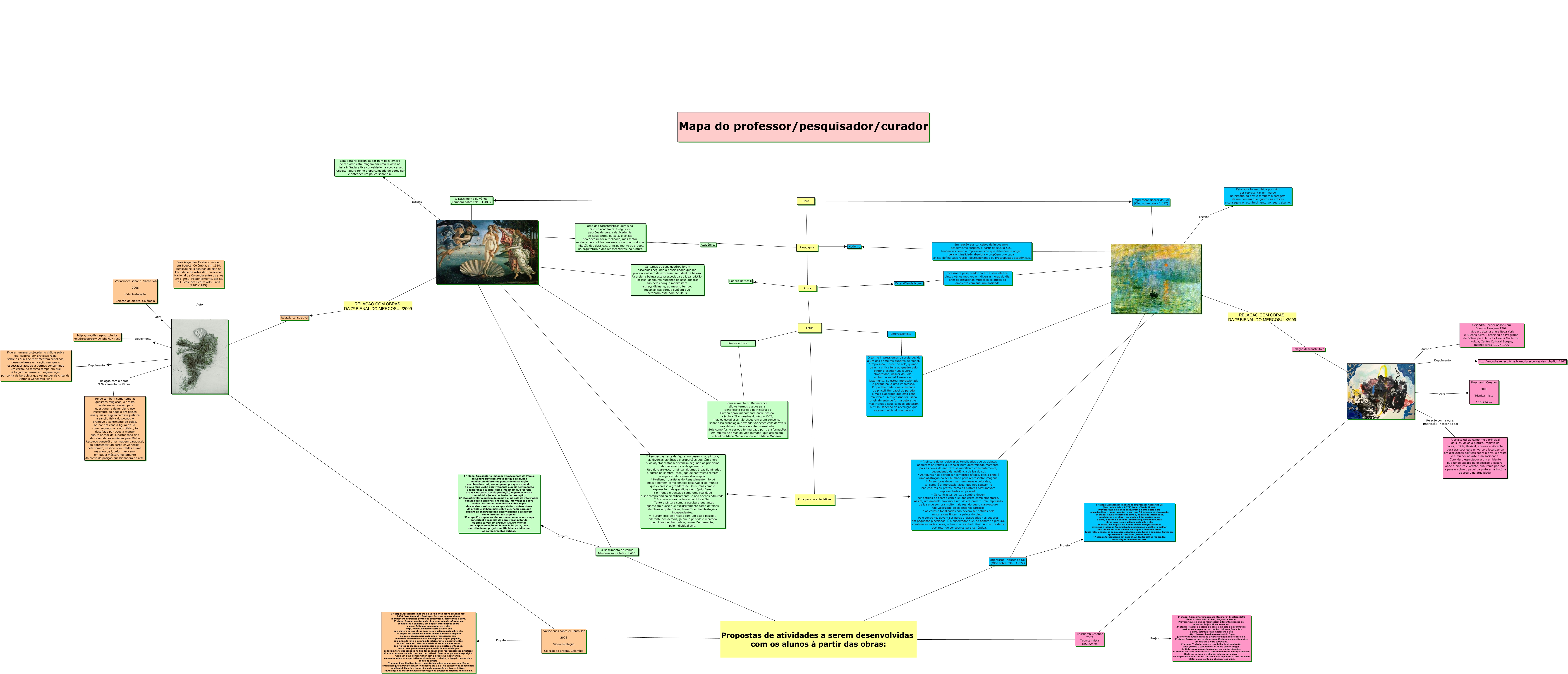 Esse mapa conceitual, produzido no IHMC CmapTools, tem a informação relacionada a: O curador de artes visuais 3 - Atividades propostas, Paradigma ???? Moderno, Autor ???? Depoimento, Paradigma Autor Sandro Botticelli, Relação construtiva ???? Depoimento, * Perspectiva: arte de figura, no desenho ou pintura, as diversas distâncias e proporções que têm entre si os objetos vistos à distância, segundo os princípios da matemática e da geometria. * Uso do claro-escuro: pintar algumas áreas iluminadas e outras na sombra, esse jogo de contrastes reforça a sugestão de volume dos corpos. * Realismo: o artistas do Renascimento não vê mais o homem como simples observador do mundo que expressa a grandeza de Deus, mas como a expressão mais grandiosa do próprio Deus. E o mundo é pensado como uma realidade a ser compreendida cientificamente, e não apenas admirada. * Inicia-se o uso da tela e da tinta à óleo. * Tanto a pintura como a escultura que antes apareciam quase que exclusivamente como detalhes de obras arquitetônicas, tornam-se manifestações independentes. * Surgimento de artistas com um estilo pessoal, diferente dos demais, já que o período é marcado pelo ideal de liberdade e, conseqüentemente, pelo individualismo. ???? ', * A pintura deve registrar as tonalidades que os objetos adquirem ao refletir a luz solar num determinado momento, pois as cores da natureza se modificam constantemente, dependendo da incidência da luz do sol. * As figuras não devem ter contornos nítidos, pois a linha é uma abstração do ser humano para representar imagens. * As sombras devem ser luminosas e coloridas, tal como é a impressão visual que nos causam, e não escuras ou pretas, como os pintores costumavam representá-las no passado. * Os contrastes de luz e sombra devem ser obtidos de acordo com a lei das cores complementares. Assim, um amarelo próximo a um violeta produz uma impressão de luz e de sombra muito mais real do que o claro-escuro tão valorizado pelos pintores barrocos. * As cores e tonalidades não devem ser obtidas pela mistura das tintas na paleta do pintor. Pelo contrário, devem ser puras e dissociadas nos quadros em pequenas pinceladas. É o observador que, ao admirar a pintura, combina as várias cores, obtendo o resultado final. A mistura deixa, portanto, de ser técnica para ser óptica. ????, O Nascimento de vênus (Têmpera sobre tela - 1.483) ???? ', Relação com a obra: O Nascimento de Vênus ???? Obra, Impressão: Nascer do Sol (Óleo sobre tela - 1.872) Projeto 1ª etapa: Apresentar imagem de Impressão: Nascer do Sol (Óleo sobre tela - 1.872) Oscar-Claude Monet, Provocar que os alunos descubram o nome desta obra após dar-lhes o nome do autor, a ano que foi feita e a técnica usada. 2ª etapa: Revelar o nome da obra e, na sala de informática, convidá-los a explorar, em duplas, informações sobre a obra, o autor e o período. Estimular que visitem outras obras do artista e saibam mais sobre ele. 3ª etapa: Em duplas, os alunos devem fotografar cenas externas e internas (com baixa luminosidade), escolher a melhor foto obtida em cada um dos dois tipos e fazer um breve texto relacionando-as com a obra estudada, suas luzes e sombras. Salvar em apresentação de slides (Power Point). 4ª etapa: Apresentação em data show dos trabalhos realizados para colegas de outras turmas., Relação com a obra: Impressão: Nascer do sol ???? A artista utiliza como meio principal de suas idéias a pintura, repleta de cores, úmida, flexível, ansiosa e vibrante, para transpor este universo e localizar-se em discussões políticas sobre a arte, o artista e a mulher na arte e na sociedade. Convida o espectador a um ambiente que funde espaço de exposição e cabaré, onde a pintura é vedete, sua ironia põe-nos a pensar sobre o papel da pintura na história da arte e na atualidade., Propostas de atividades a serem desenvolvidas com os alunos à partir das obras: ????, Propostas de atividades a serem desenvolvidas com os alunos à partir das obras: ????, Roscharch Creation 2009 Técnica mista 185x224cm Projeto 1ª etapa: Apresentar imagem de Roscharch Creation 2009 Técnica mista 185x224cm, Alejandra Seeber. Provocar que os alunos manifestem diferentes pontos de observação justificando a obra. 2ª etapa: Revelar a autoria da obra e, na sala de informática, convidá-los a explorar, em duplas, informações sobre a obra. Estimular que explorem o site http://www.bienalmercosul.art.br/ que que visitem outras obras da artista e saibam mais sobre ela. 3ª etapa: Provocar que os alunos manifestem seus sentimentos em relação a obra apreciada. 4ª etapa: Trabalho prático com folha de desenho A4, tinta guache e canudinhos. O aluno coloca pingos de tinta sobre o papel e assopra em várias direções ao som de músicas selecionadas, alternando ritmo lento/acelerado. Dado por pronto o trabalho, colocar para secar. 5ª etapa: Para finalizar, os trabalhos são expostos e cada um deve relatar o que sente ao observar sua obra., Depoimento ???? http://moodle.regesd.tche.br /mod/resource/view.php?id=7169, Escolha Esta obra foi escolhida por mim por representar um marco na história da arte e também a coragem de um homem que ignorou as críticas e conseguiu o reconhecimento por seu trabalho., Autor ???? Relação com a obra: Impressão: Nascer do sol, Impressionista ???? O termo impressionismo surgiu devido a um dos primeiros quadros de Monet, "Impressão, nascer do sol", quando de uma crítica feita ao quadro pelo pintor e escritor Louis Leroy: "Impressão, nascer do Sol” – eu bem o sabia! Pensava eu, justamente, se estou impressionado é porque há lá uma impressão. E que liberdade, que suavidade de pincel! Um papel de parede é mais elaborado que esta cena marinha." . A expressão foi usada originalmente de forma pejorativa, mas Monet e seus colegas adotaram o título, sabendo da revolução que estavam iniciando na pintura., Relação construtiva ???? Depoimento, Rela