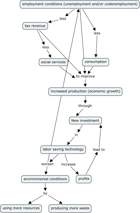 This Concept Map, created with IHMC CmapTools, has information related to: treadmill of production, New investment in labor saving technology, environmental conditions by using more resources, tax revenue less social services, labor saving technology increase profits, environmental conditions by producing more waste, increased production (economic growth) through New investment, labor saving technology worsen environmental conditions, tax revenue to improve increased production (economic growth), employment conditions (unemployment and/or underemployment) to improve increased production (economic growth), employment conditions (unemployment and/or underemployment) less tax revenue, labor saving technology worsen employment conditions (unemployment and/or underemployment), employment conditions (unemployment and/or underemployment) less consumption, social services to improve increased production (economic growth), profits lead to New investment, consumption to improve increased production (economic growth)