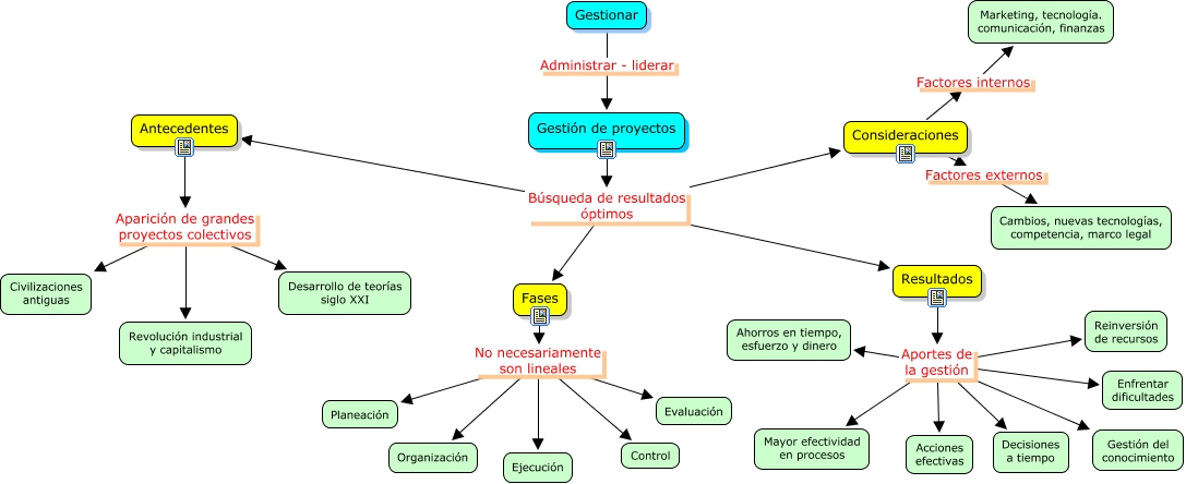 Este Cmap, tiene información relacionada con: gestión de proyectos, Resultados Aportes de la gestión Mayor efectividad en procesos, Resultados Aportes de la gestión Acciones efectivas, Resultados Aportes de la gestión Ahorros en tiempo, esfuerzo y dinero, Fases No necesariamente son lineales Ejecución, Gestionar Administrar - liderar Gestión de proyectos, Fases No necesariamente son lineales Organización, Resultados Aportes de la gestión Reinversión de recursos, Consideraciones Factores externos Cambios, nuevas tecnologías, competencia, marco legal, Fases No necesariamente son lineales Control, Resultados Aportes de la gestión Decisiones a tiempo, Gestión de proyectos Búsqueda de resultados óptimos Antecedentes, Consideraciones Factores internos Marketing, tecnología. comunicación, finanzas, Antecedentes Aparición de grandes proyectos colectivos Desarrollo de teorías siglo XXI, Antecedentes Aparición de grandes proyectos colectivos Civilizaciones antiguas, Fases No necesariamente son lineales Evaluación, Resultados Aportes de la gestión Gestión del conocimiento, Fases No necesariamente son lineales Planeación, Gestión de proyectos Búsqueda de resultados óptimos Resultados, Antecedentes Aparición de grandes proyectos colectivos Revolución industrial y capitalismo, Gestión de proyectos Búsqueda de resultados óptimos Fases