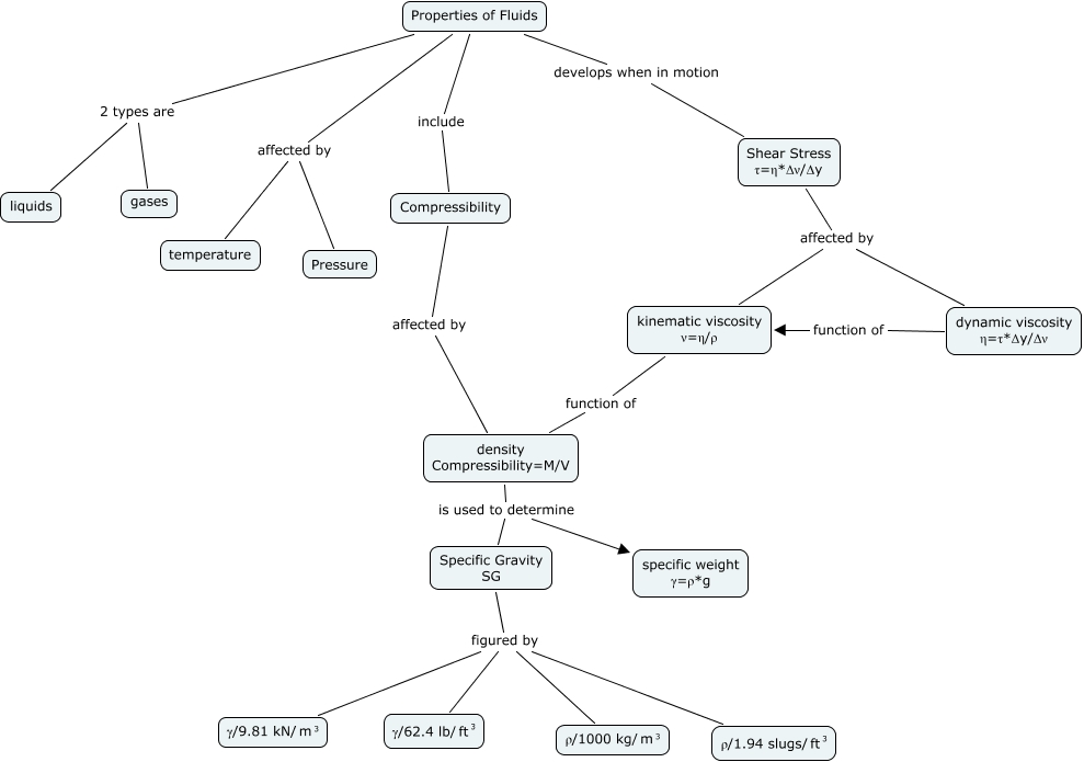 This Concept Map, created with IHMC CmapTools, has information related to: fundimental fluid properties-1, Properties of Fluids affected by temperature, Properties of Fluids 2 types are gases, Shear Stress τ=η*Δν/Δy affected by dynamic viscosity η=τ*Δy/Δν, Specific Gravity SG figured by <math xmlns="http://www.w3.org/1998/Math/MathML"> <mrow> <mtext> ρ/1.94 slugs/ </mtext> <mmultiscripts> <mtext> ft </mtext> <none/> <mtext> 3 </mtext> </mmultiscripts> </mrow> </math>, density Compressibility=M/V is used to determine Specific Gravity SG, Specific Gravity SG figured by <math xmlns="http://www.w3.org/1998/Math/MathML"> <mtext> γ/9.81 kN/ </mtext> <mmultiscripts> <mtext> m </mtext> <none/> <mtext> 3 </mtext> </mmultiscripts> </math>, kinematic viscosity ν=η/ρ function of density Compressibility=M/V, Properties of Fluids include Compressibility, Properties of Fluids develops when in motion Shear Stress τ=η*Δν/Δy, Shear Stress τ=η*Δν/Δy affected by kinematic viscosity ν=η/ρ, dynamic viscosity η=τ*Δy/Δν function of kinematic viscosity ν=η/ρ, Specific Gravity SG figured by <math xmlns="http://www.w3.org/1998/Math/MathML"> <mrow> <mtext> ρ/1000 kg/ </mtext> <mmultiscripts> <mtext> m </mtext> <none/> <mtext> 3 </mtext> </mmultiscripts> </mrow> </math>, Properties of Fluids 2 types are liquids, Compressibility affected by density Compressibility=M/V, density Compressibility=M/V is used to determine specific weight γ=ρ*g, Properties of Fluids affected by Pressure, Specific Gravity SG figured by <math xmlns="http://www.w3.org/1998/Math/MathML"> <mtext> γ/62.4 lb/ </mtext> <mmultiscripts> <mtext> ft </mtext> <none/> <mtext> 3 </mtext> </mmultiscripts> </math>