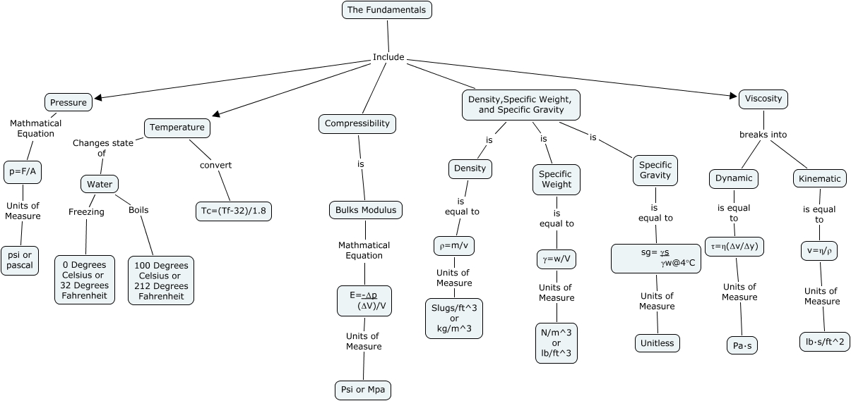 This Concept Map, created with IHMC CmapTools, has information related to: Week 1, The Fundamentals Include Temperature, τ=η(Δv/Δy) Units of Measure Pa⋅s, γ=w/V Units of Measure N/m^3 or lb/ft^3, Viscosity breaks into Dynamic, Density,Specific Weight, and Specific Gravity is Specific Gravity, sg= γs γw@4°C Units of Measure Unitless, The Fundamentals Include Density,Specific Weight, and Specific Gravity, Density,Specific Weight, and Specific Gravity is Specific Weight, Specific Weight is equal to γ=w/V, Density is equal to ρ=m/v, E=-Δp (ΔV)/V Units of Measure Psi or Mpa, p=F/A Units of Measure psi or pascal, Temperature Changes state of Water, v=η/ρ Units of Measure lb⋅s/ft^2, Temperature convert Tc=(Tf-32)/1.8, Density,Specific Weight, and Specific Gravity is Density, Water Freezing 0 Degrees Celsius or 32 Degrees Fahrenheit, Viscosity breaks into Kinematic, Dynamic is equal to τ=η(Δv/Δy), Water Boils 100 Degrees Celsius or 212 Degrees Fahrenheit