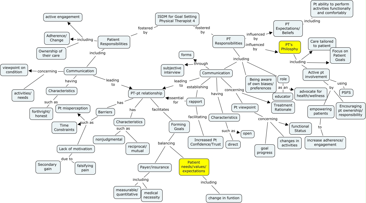 This Concept Map, created with IHMC CmapTools, has information related to: PT 4.cmap, Active pt involvement using PSFS, Active pt involvement by Encouraging pt ownership/ responsibility, role as an advocate for health/wellness, Lack of motivation due to falsifying pain, PT-pt relationship has Barriers, Lack of motivation due to Secondary gain, PT's Philosphy including Focus on Patient Goals, Payer/insurance including medical necessity, ISDM for Goal Setting Physical Therapist 4 fostered by Patient Responsibilities, Pt viewpoint concerning changes in activities, Patient needs/values/ expectations including change in funtion, PT-pt relationship facilitates Forming Goals, Communication establishing rapport, Pt viewpoint concerning goal progress, Forming Goals balancing Patient needs/values/ expectations, PT Responsibilities including role, PT Responsibilities including Communication, role as an educator, rapport facilitating Increased Pt Confidence/Trust, Barriers such as Time Constraints