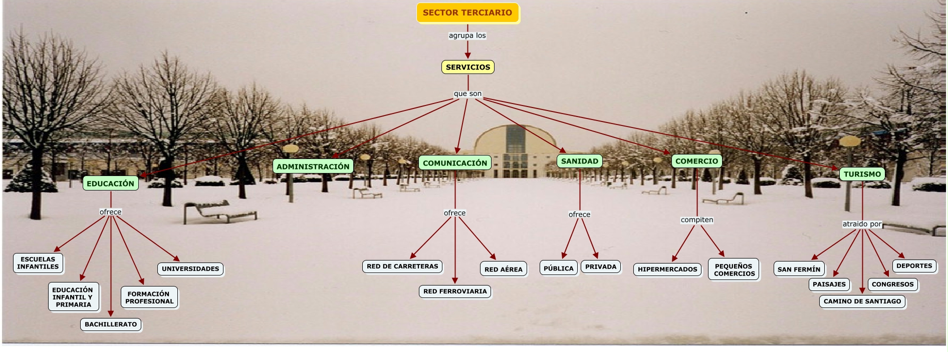 Este Cmap, tiene información relacionada con: sector terciario mapa c, SERVICIOS que son TURISMO, COMUNICACIÓN ofrece RED DE CARRETERAS, EDUCACIÓN ofrece EDUCACIÓN INFANTIL Y PRIMARIA, SERVICIOS que son ADMINISTRACIÓN, EDUCACIÓN ofrece UNIVERSIDADES, TURISMO atraido por CAMINO DE SANTIAGO, SANIDAD ofrece PRIVADA, EDUCACIÓN ofrece FORMACIÓN PROFESIONAL, TURISMO atraido por DEPORTES, COMERCIO compiten HIPERMERCADOS, COMUNICACIÓN ofrece RED AÉREA, EDUCACIÓN ofrece BACHILLERATO, SANIDAD ofrece PÚBLICA, COMERCIO compiten PEQUEÑOS COMERCIOS, EDUCACIÓN ofrece ESCUELAS INFANTILES, TURISMO atraido por PAISAJES, SERVICIOS que son EDUCACIÓN, COMUNICACIÓN ofrece RED FERROVIARIA, TURISMO atraido por SAN FERMÍN, SERVICIOS que son SANIDAD
