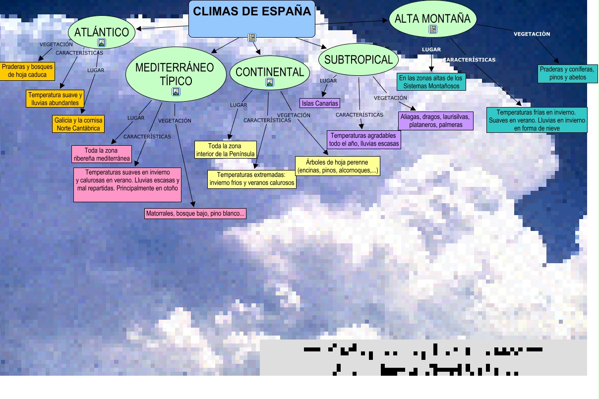 Este Cmap, tiene información relacionada con: Mapa conceptual de los climas de España, ATLÁNTICO VEGETACIÓN Praderas y bosques de hoja caduca, CLIMAS DE ESPAÑA ???? ATLÁNTICO, CLIMAS DE ESPAÑA ???? SUBTROPICAL, MEDITERRÁNEO TÍPICO LUGAR Toda la zona ribereña mediterránea, ALTA MONTAÑA LUGAR En las zonas altas de los Sistemas Montañosos, CLIMAS DE ESPAÑA ???? CONTINENTAL, CONTINENTAL CARACTERÍSTICAS Temperaturas extremadas: invierno frios y veranos calurosos, SUBTROPICAL CARACTERÍSTICAS Temperaturas agradables todo el año, lluvias escasas, ALTA MONTAÑA CARACTERÍSTICAS Temperaturas frías en invierno. Suaves en verano. Lluvias en invierno en forma de nieve, CLIMAS DE ESPAÑA ???? MEDITERRÁNEO TÍPICO, ALTA MONTAÑA VEGETACIÓN Praderas y coníferas, pinos y abetos, ATLÁNTICO CARACTERÍSTICAS Temperatura suave y lluvias abundantes, ATLÁNTICO LUGAR Galicia y la cornisa Norte Cantábrica, CLIMAS DE ESPAÑA ???? ALTA MONTAÑA, SUBTROPICAL VEGETACIÓN Aliagas, dragos, laurisilvas, plataneros, palmeras, MEDITERRÁNEO TÍPICO CARACTERÍSTICAS Temperaturas suaves en invierno y calurosas en verano. Lluvias escasas y mal repartidas. Principalmente en otoño, CONTINENTAL VEGETACIÓN Árboles de hoja perenne (encinas, pinos, alcornoques,...), CONTINENTAL LUGAR Toda la zona interior de la Península, SUBTROPICAL LUGAR Islas Canarias, MEDITERRÁNEO TÍPICO VEGETACIÓN Matorrales, bosque bajo, pino blanco...