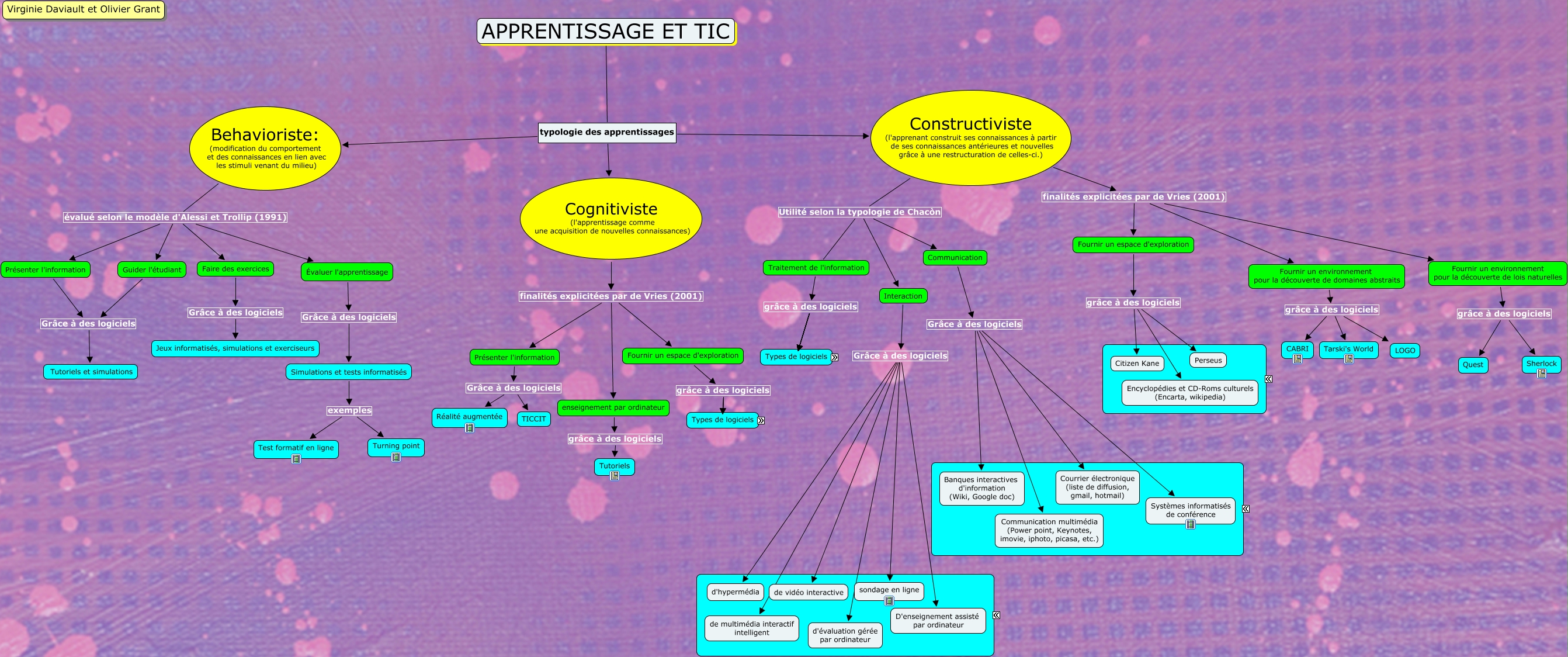 Cette carte de concepts créée avec IHMC CmapTools traite de: TP1_version_final, Cognitiviste (l'apprentissage comme une acquisition de nouvelles connaissances) finalités explicitées par de Vries (2001) enseignement par ordinateur, APPRENTISSAGE ET TIC typologie des apprentissages Constructiviste (l'apprenant construit ses connaissances à partir de ses connaissances antérieures et nouvelles grâce à une restructuration de celles-ci.), Interaction Grâce à des logiciels d'hypermédia, Constructiviste (l'apprenant construit ses connaissances à partir de ses connaissances antérieures et nouvelles grâce à une restructuration de celles-ci.) finalités explicitées par de Vries (2001) Fournir un espace d'exploration, Simulations et tests informatisés exemples Test formatif en ligne, Traitement de l'information grâce à des logiciels Édition électronique, Fournir un environnement pour la découverte de lois naturelles grâce à des logiciels Sherlock, Communication Grâce à des logiciels Courrier électronique (liste de diffusion, gmail, hotmail), Constructiviste (l'apprenant construit ses connaissances à partir de ses connaissances antérieures et nouvelles grâce à une restructuration de celles-ci.) Utilité selon la typologie de Chacòn Interaction, Interaction Grâce à des logiciels de vidéo interactive, Fournir un environnement pour la découverte de domaines abstraits grâce à des logiciels LOGO, Traitement de l'information grâce à des logiciels traitement numérique (Excel, numbers), Behavioriste: (modification du comportement et des connaissances en lien avec les stimuli venant du milieu) évalué selon le modèle d'Alessi et Trollip (1991) Évaluer l'apprentissage, Traitement de l'information grâce à des logiciels Systèmes intégrés, Fournir un espace d'exploration grâce à des logiciels Citizen Kane, Traitement de l'information grâce à des logiciels Dessin assisté par ordinateur, Fournir un espace d'exploration grâce à des logiciels Perseus, Constructiviste (l'apprenant construit ses connaissances à partir de ses connaissances antérieures et nouvelles grâce à une restructuration de celles-ci.) finalités explicitées par de Vries (2001) Fournir un environnement pour la découverte de lois naturelles, Behavioriste: (modification du comportement et des connaissances en lien avec les stimuli venant du milieu) évalué selon le modèle d'Alessi et Trollip (1991) Guider l'étudiant, Constructiviste (l'apprenant construit ses connaissances à partir de ses connaissances antérieures et nouvelles grâce à une restructuration de celles-ci.) Utilité selon la typologie de Chacòn Traitement de l'information