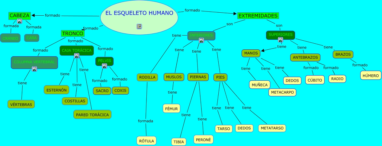 Este Cmap, tiene información relacionada con: El esqueleto humano, PIES tiene DEDOS, SUPERIORES tiene MANOS, SUPERIORES tiene ANTEBRAZOS, BRAZOS formado HÚMERO, PIERNAS tiene PERONÉ, EL ESQUELETO HUMANO formado EXTREMIDADES, CAJA TORÁCICA tiene PARED TORÁCICA, CABEZA formada CARA, EXTREMIDADES son INFERIORES, TRONCO formado PELVIS, EXTREMIDADES son SUPERIORES, CAJA TORÁCICA tiene ESTERNÓN, PIES tiene TARSO, INFERIORES tiene PIES, EL ESQUELETO HUMANO formado TRONCO, INFERIORES tiene PIERNAS, MANOS tiene METACARPO, EL ESQUELETO HUMANO formado CABEZA, CABEZA formada CRÁNEO, MANOS tiene MUÑECA